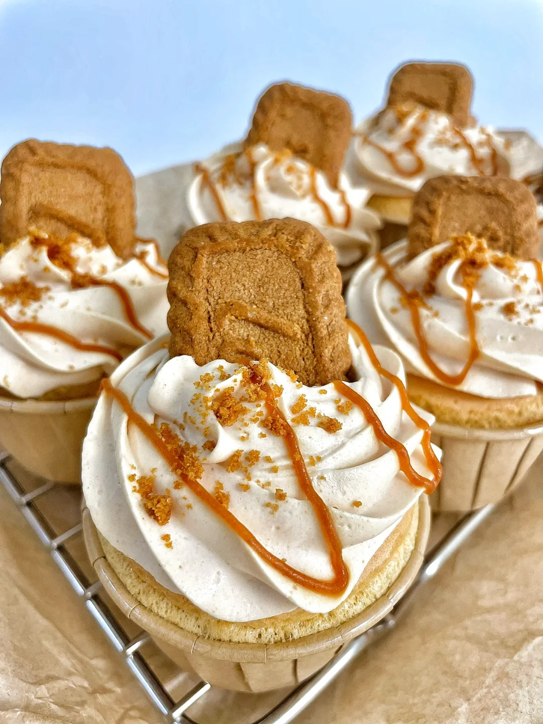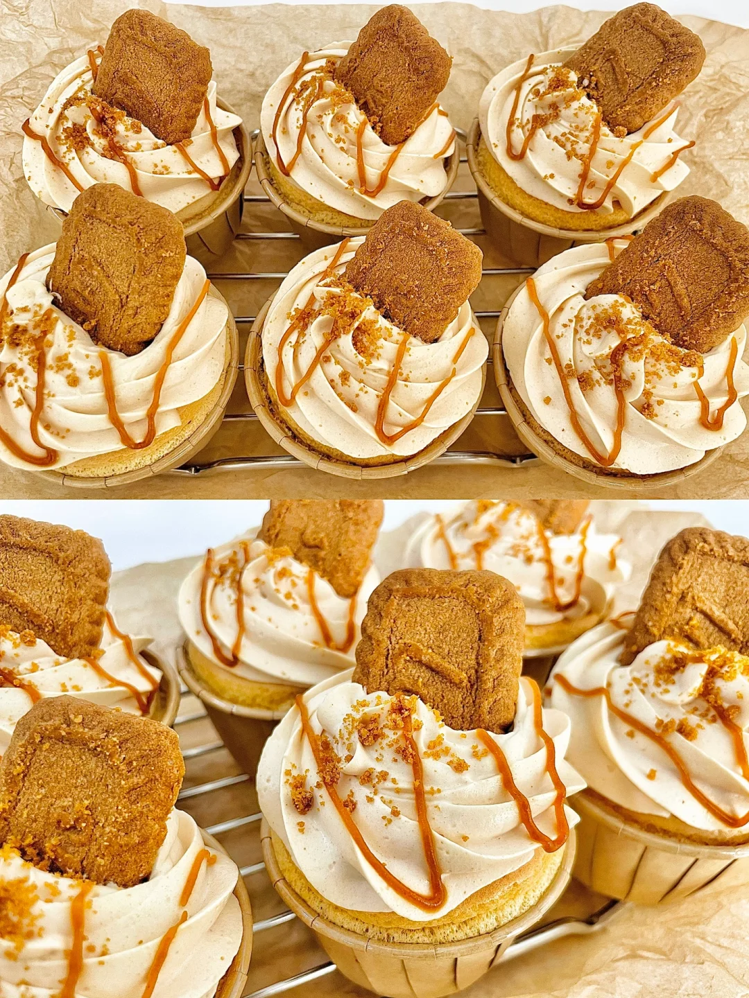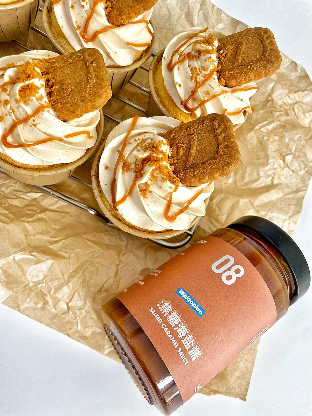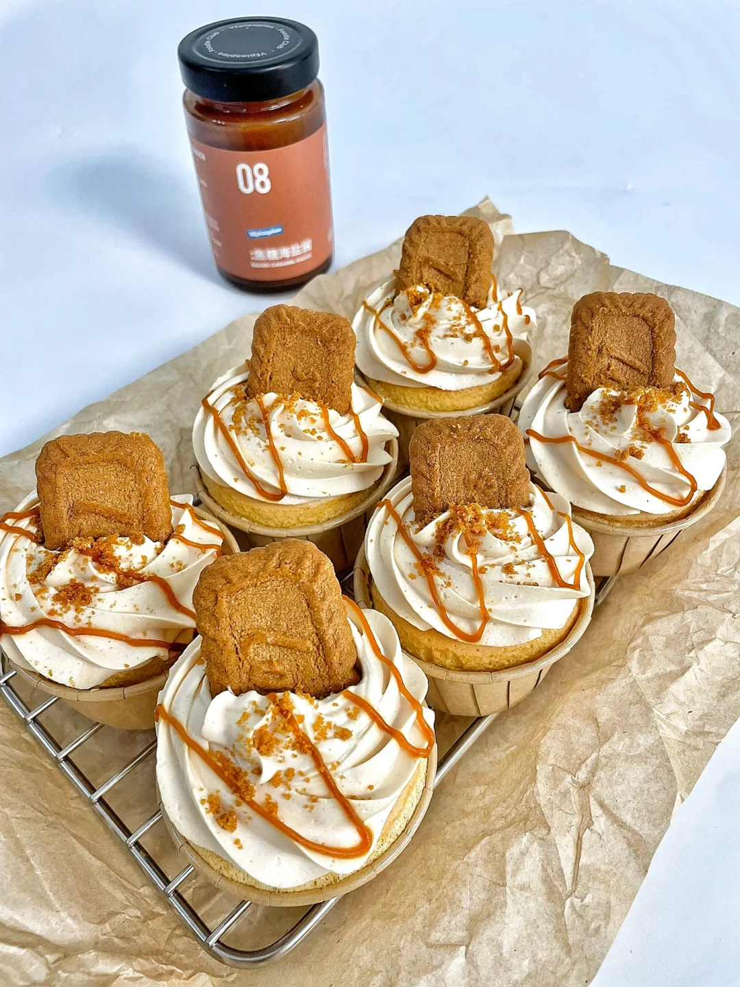 8⃣️淡奶油➕焦糖海盐酱打发出纹路,装在裱花袋里,把奶油挤进蛋糕胚上,装饰焦糖饼干