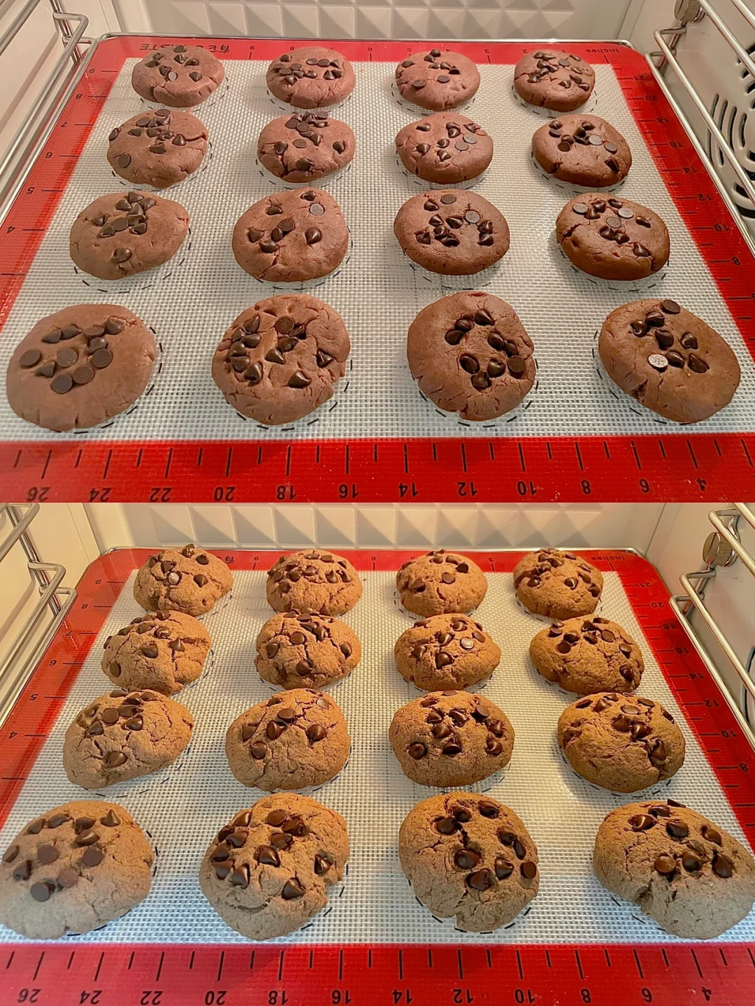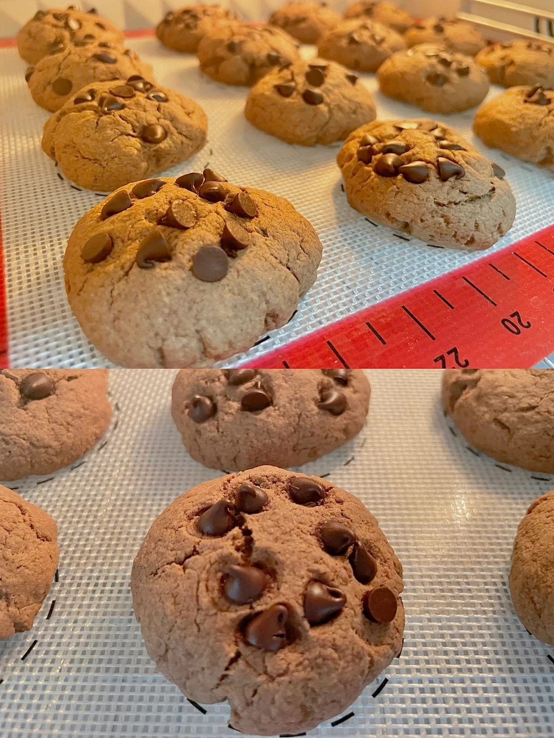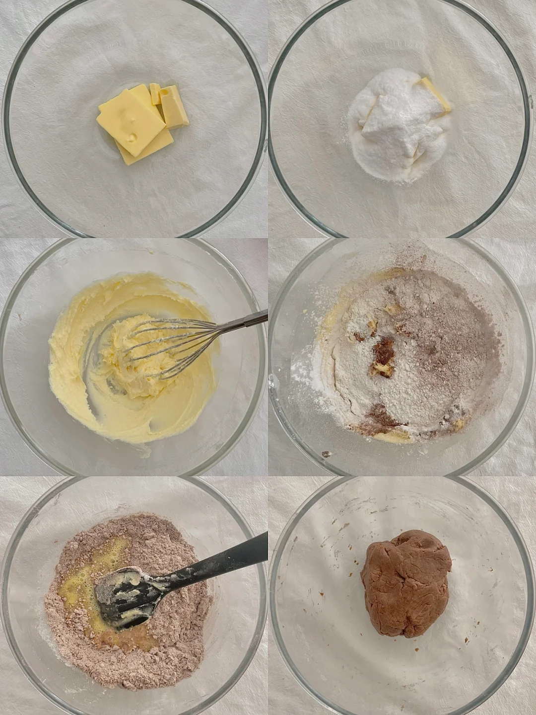 【所需食材】 无盐黄油100克|糖粉60克|可可粉10克|低筋面粉160克|玉米淀粉20克|泡打粉4克|盐1克|全蛋液40克|耐高温巧克力豆适量 【制作过程】 1⃣️软化的无盐黄油加糖粉,用打蛋器搅打至蓬松发白 2⃣️过筛加入低筋面粉、可可粉,泡打粉和盐混合均匀至没有干粉,再加入蛋液下手捏成团,平分成16个,揉圆按扁,表面放上耐高温巧克力豆按压一下 3⃣️180度烘烤12分钟左右