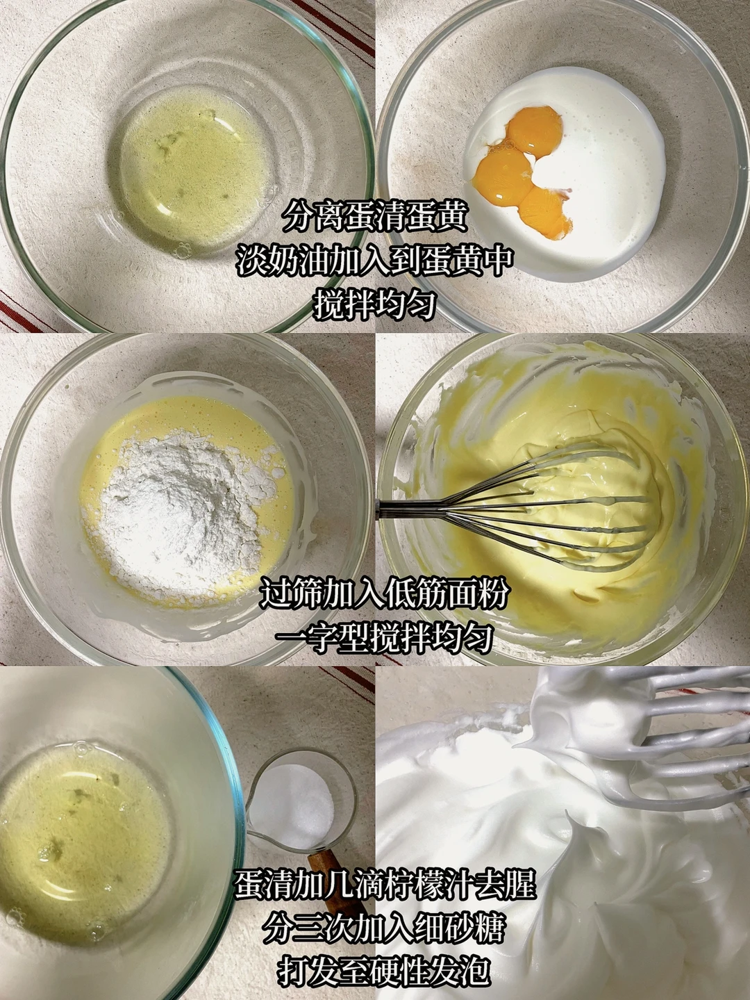 4⃣️蛋清加几滴柠檬汁去腥,分三次加入细砂糖,打发至硬性发泡(提起打蛋器,打蛋器和盆中的蛋清均为小直角)