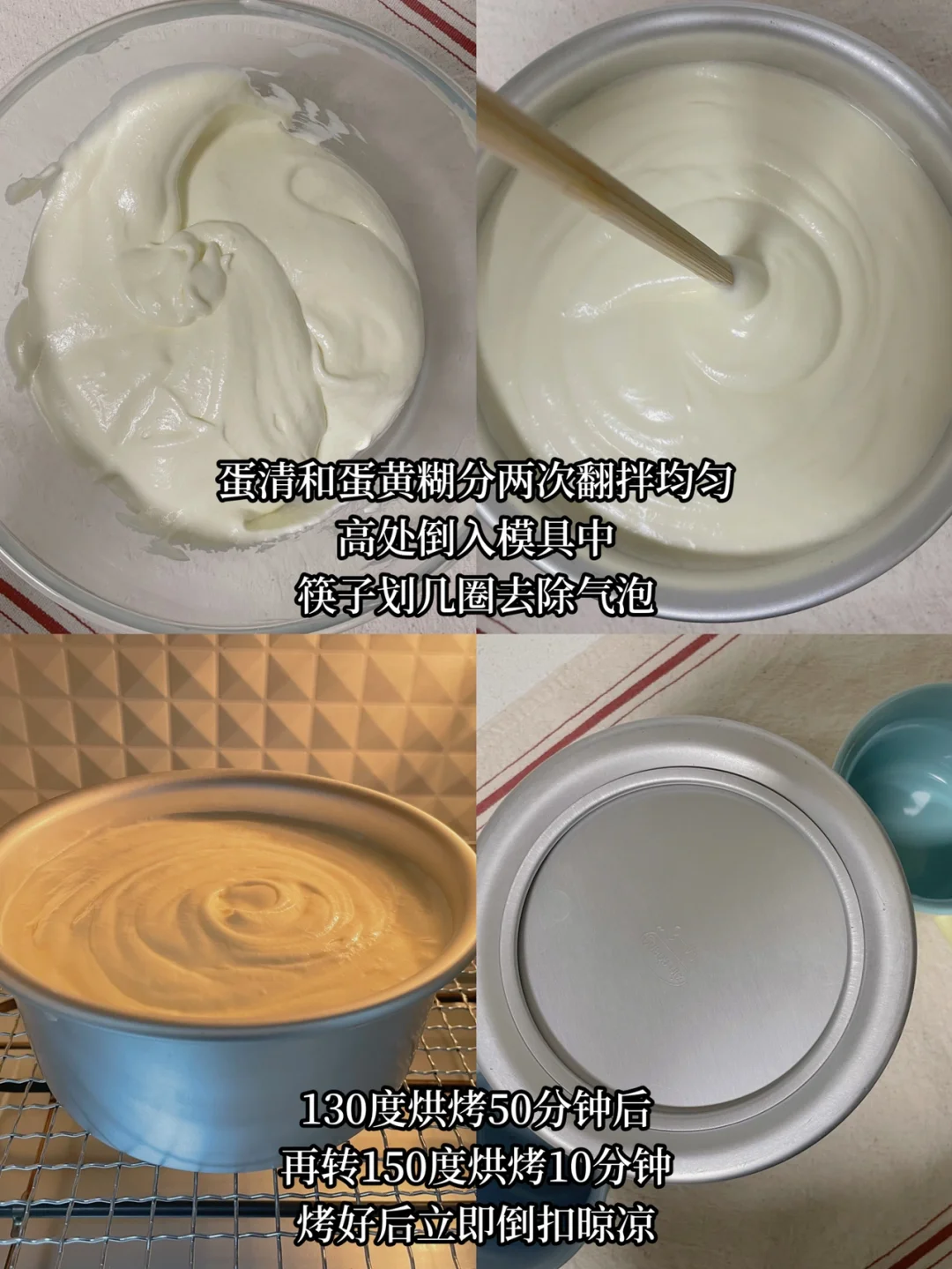 8⃣️烤好后立即从烤箱取出,摔一下震出热气,再倒扣充分晾凉(需要两小时左右),之后再脱模