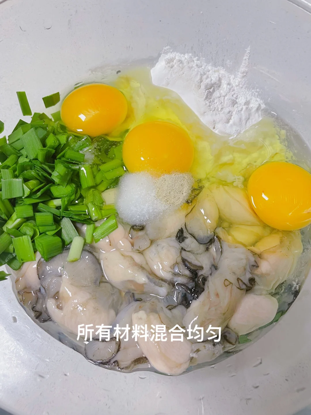 海蛎子、鸡蛋、韭菜末、红薯淀粉、盐、胡椒粉混合均匀,平底锅放油煎至两面金黄。