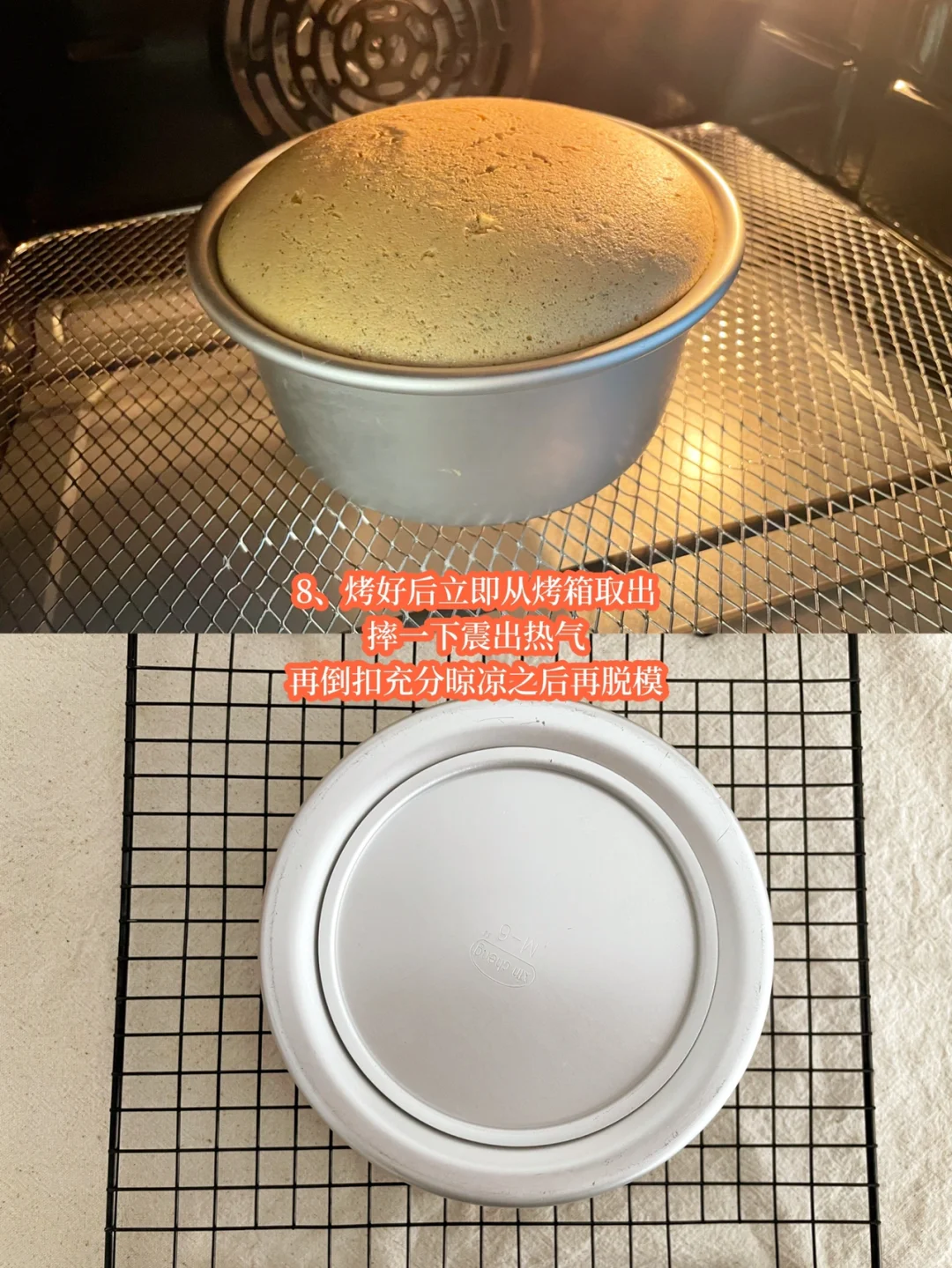 7⃣️烤好后立即从烤箱取出,摔一下震出热气,再倒扣充分晾凉(需要两小时左右),之后再脱模