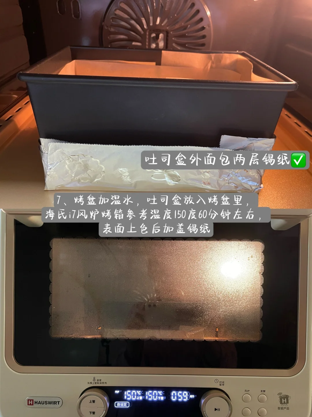 7⃣️烤盘加温水,吐司盒放入烤盘里,海氏i7风炉烤箱参考温度150度60分钟左右,表面上色后加盖锡纸