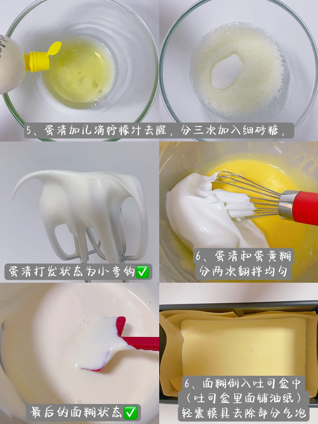 5⃣️蛋清加几滴柠檬汁去腥,分三次加入细砂糖,打发蛋清至小弯钩状态