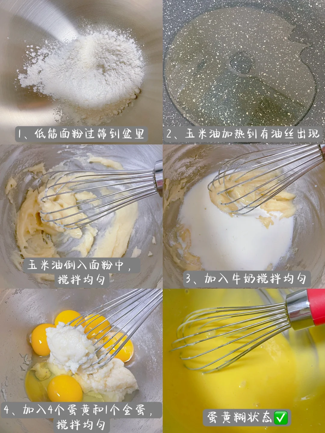 2⃣️玉米油加热到有油丝出现,倒入面粉中,搅拌均匀