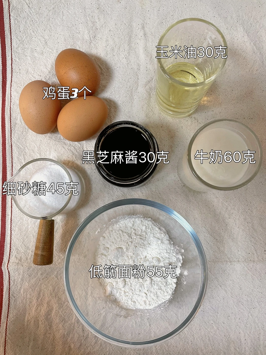 牛奶60克|玉米油30克|低筋面粉55克|鸡蛋3个|黑芝麻酱30克|细砂糖45克