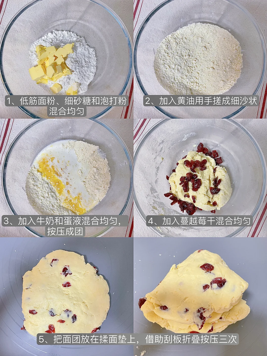 5⃣️把面团放在揉面垫上,借助刮板折叠按压三次,目的是让司康口感更加酥软蓬松