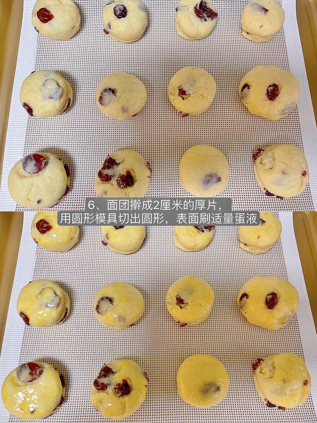 6⃣️面团擀成2厘米的厚片,用圆形模具切出圆形,表面刷适量蛋液,蛋液不要刷太多,以免影响司康膨胀