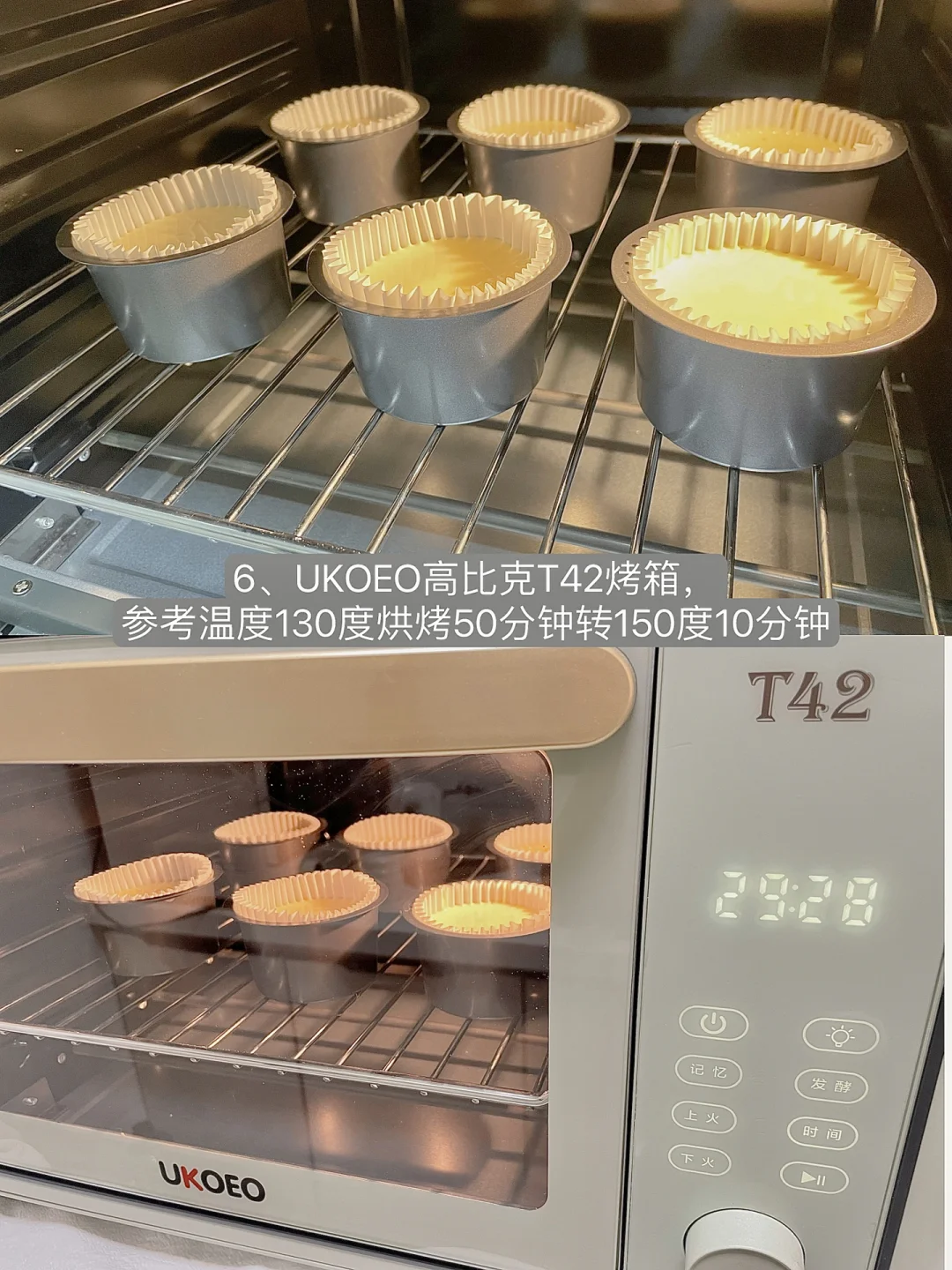6⃣️(烤箱提前预热)我用的是UKOEO高比克T42烤箱,参考温度130度烘烤50分钟转150度10分钟,烤好的戚风蛋糕上色均匀,组织细腻