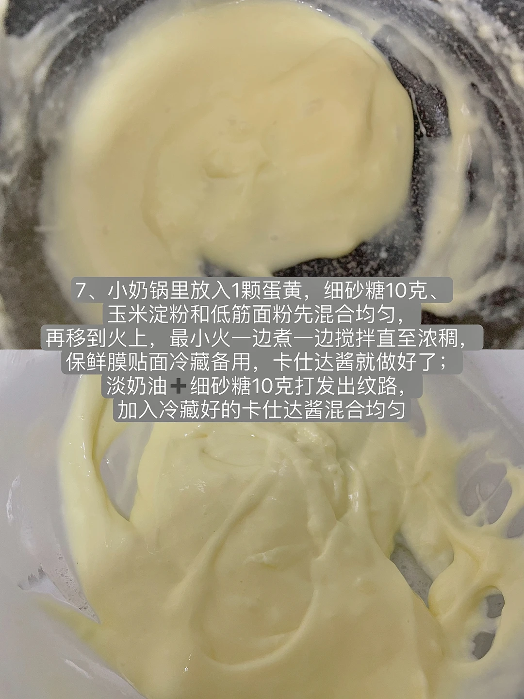 8⃣️小奶锅里放入1颗蛋黄,细砂糖10克、玉米淀粉和低筋面粉先混合均匀,再移到火上,最小火一边煮一边搅拌直至浓稠,保鲜膜贴面冷藏备用,卡仕达酱就做好了;淡奶油➕细砂糖10克打发出纹路,加入冷藏好的卡仕达酱混合均匀,卡仕达奶油酱装在裱花袋里,把酱挤进蛋糕胚里就完成了