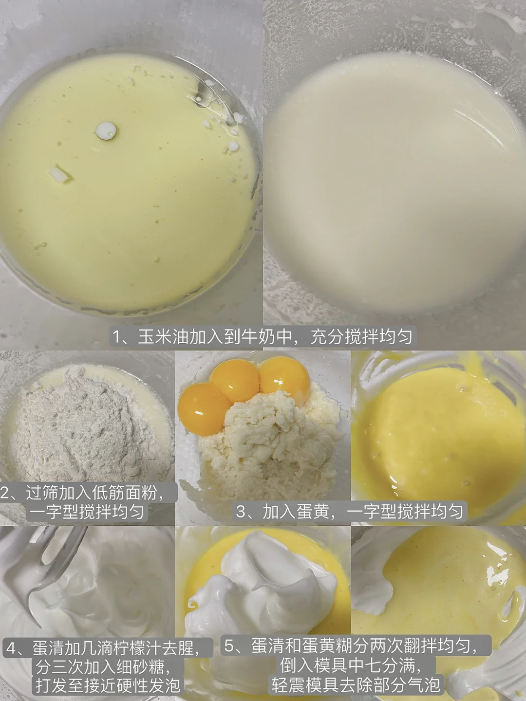 鸡蛋3个|玉米油30克|牛奶40克|低筋面粉55克|柠檬汁几滴|细砂糖45克