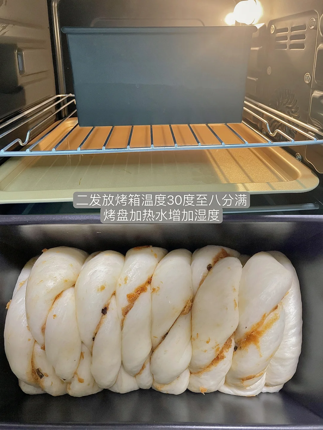 2⃣️面团放置在温暖湿润的地方,一发至二倍大,拍扁排气,擀开呈长方形,下半部分涂抹沙拉酱,放适量海苔肉松,再把上半部分折下来盖住,切条,顶部不切断,每一条都拧成麻花,卷起收口朝下放吐司盒里