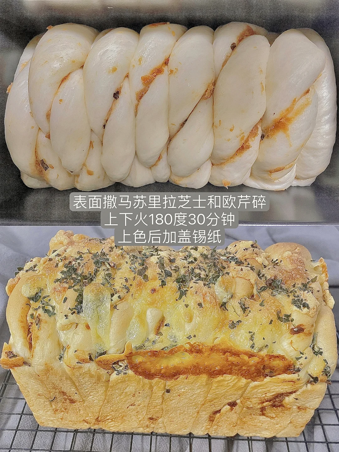 4⃣️上下火180度烘烤30分钟左右(具体温度和时间根据自己的烤箱调整),顶部上色后加盖锡纸,以免烤糊