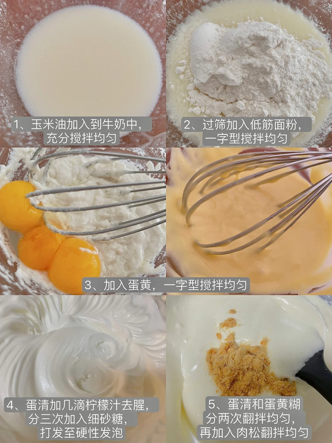 鸡蛋3个|玉米油30克|牛奶52克|低筋面粉55克|柠檬汁几滴|细砂糖45克