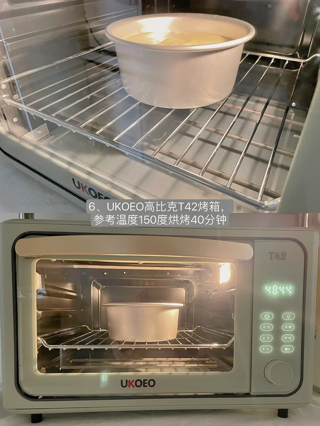 6⃣️(烤箱提前预热)我用的是UKOEO高比克T42烤箱,参考温度150度烘烤40分钟,烤好的戚风蛋糕上色均匀,组织细腻