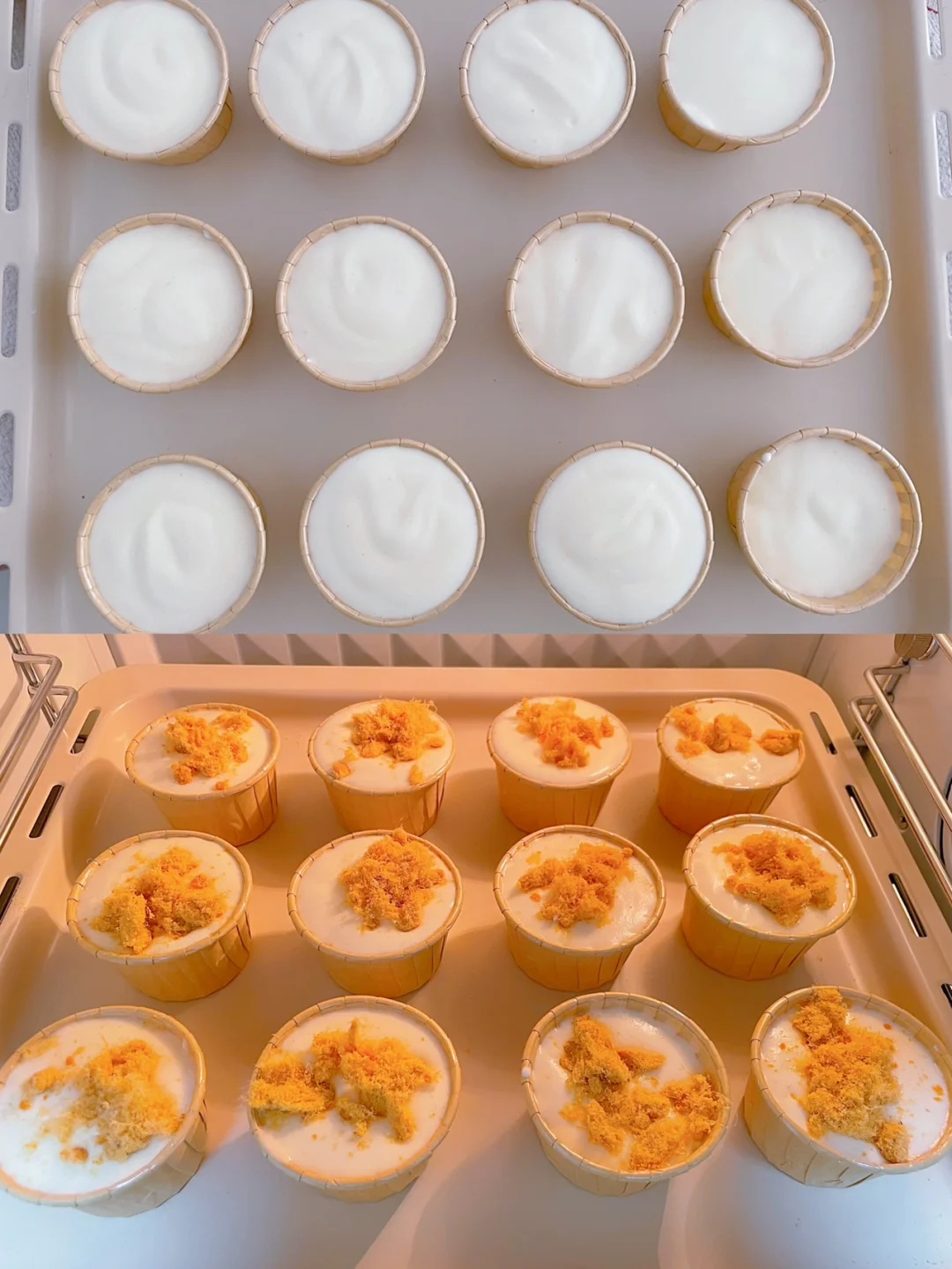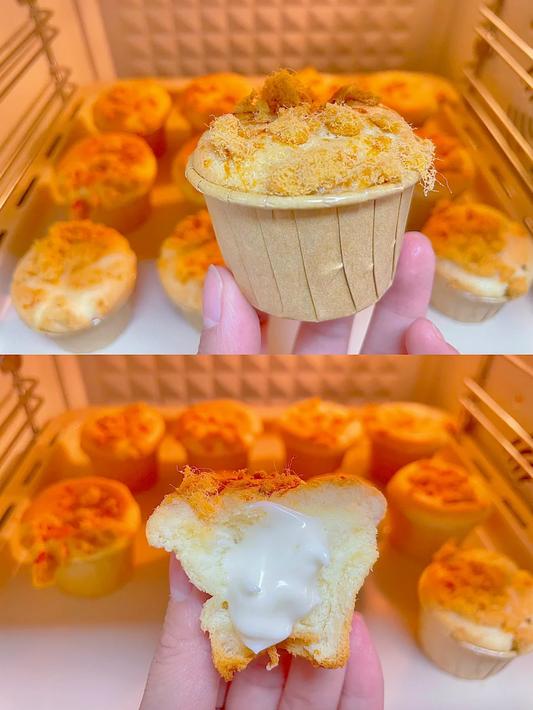 5⃣️蛋清和蛋黄糊分两次翻拌均匀,纸杯中挤入一半的蛋糕糊,中间挤沙拉酱,再挤上蛋糕糊,表面撒肉松
