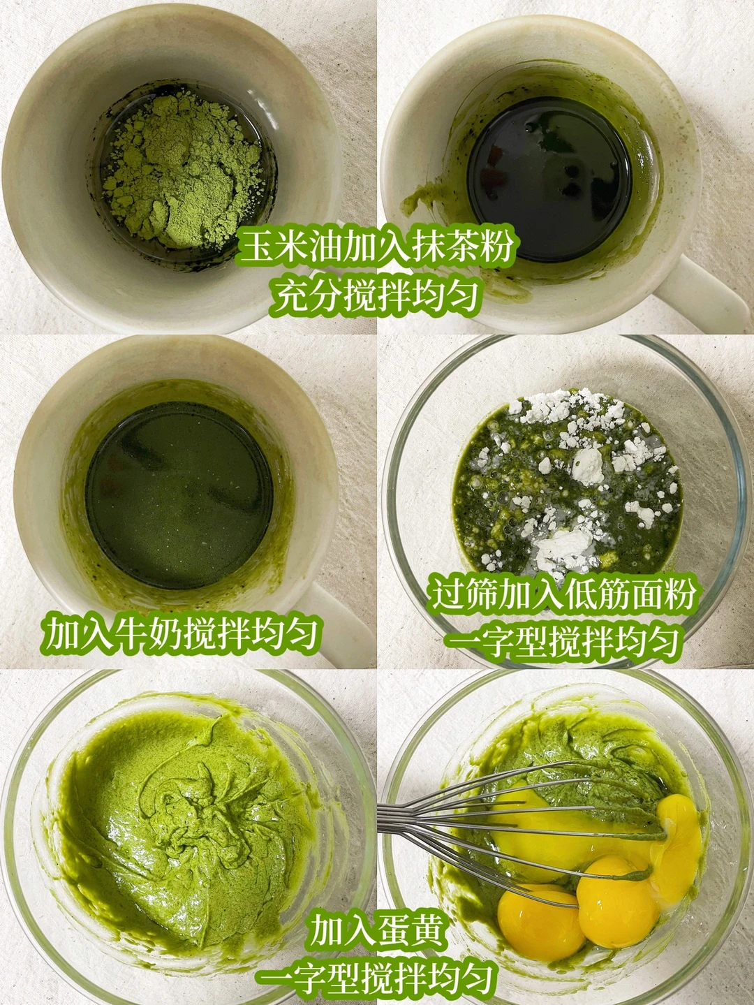 1⃣️玉米油加入抹茶粉,充分搅拌均匀(抹茶粉易溶于油)