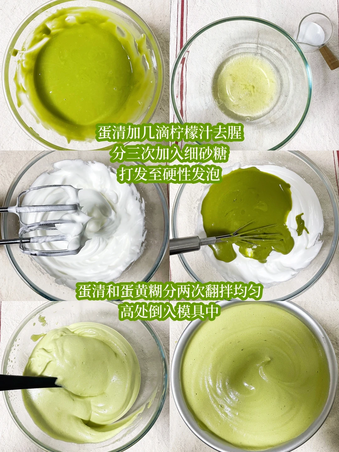 6⃣️蛋清和蛋黄糊分两次翻拌均匀,高处倒入模具中