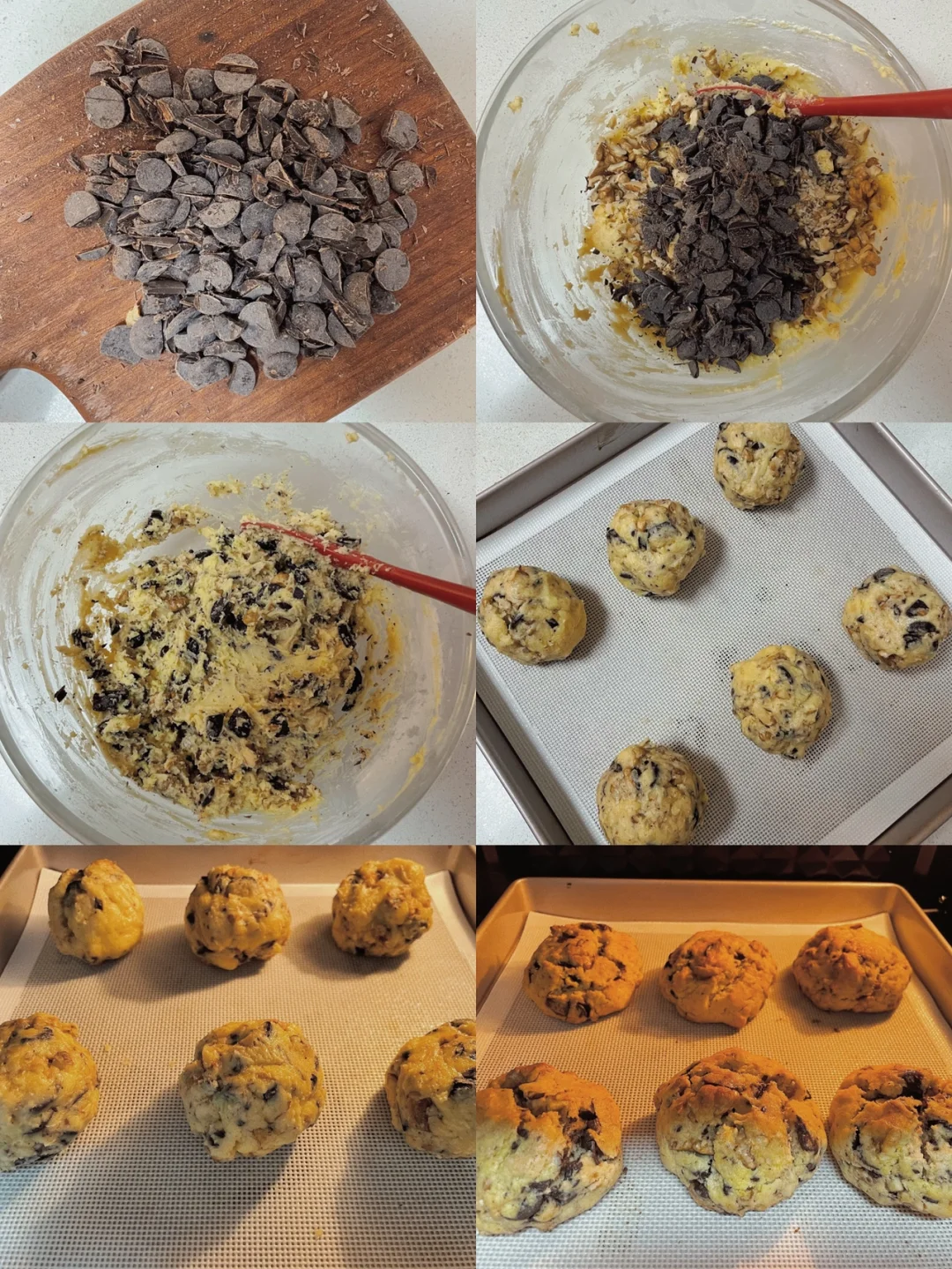 【所需食材】 低筋面粉155克|黄油100克|黄砂糖30克|细砂糖30克|鸡蛋1个|香草精2克|核桃仁80克|黑巧克力100克|泡打粉2克|小苏打2克 【做法】 1⃣️软化黄油用蛋抽搅打顺滑,放入黄砂糖和细砂糖搅打均匀 2⃣️分三次加入鸡蛋液,每次搅打均匀再加下一次 3⃣️过筛加入低筋面粉搅拌均匀,再加入泡打粉和小苏打搅拌均匀 4⃣️加入切碎的核桃仁和黑巧克力搅拌均匀 5⃣️面团放冰箱冷藏半小时 6⃣️平分成6份,放入预热好的烤箱180度烘烤15分钟左右