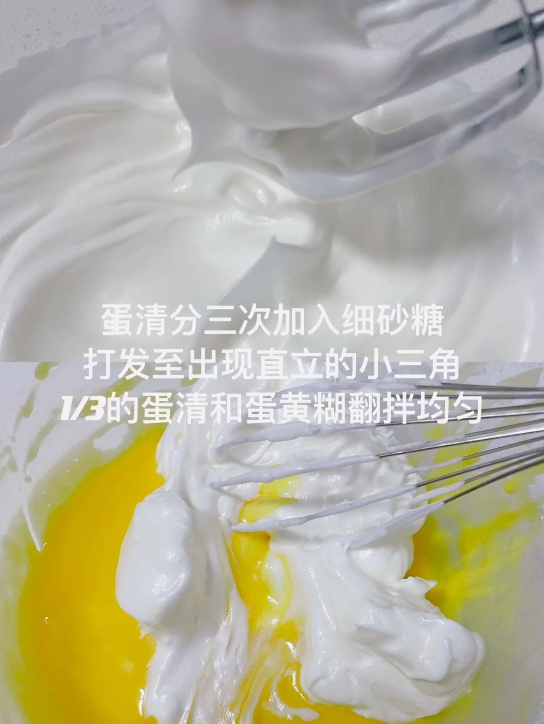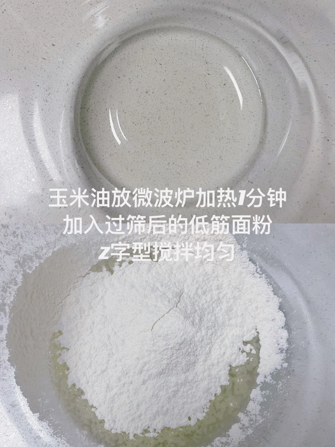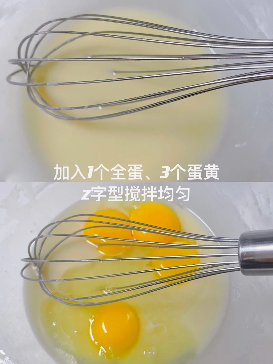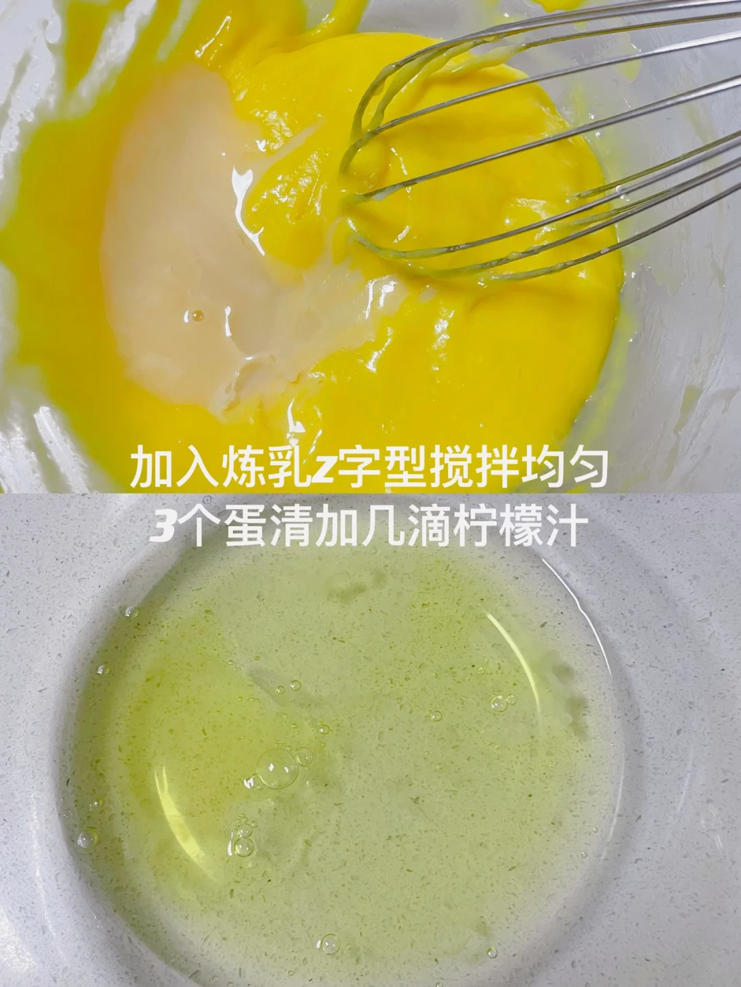 用料: 玉米油45g、低筋面粉50g、鸡蛋4个(蛋黄糊需要1个全蛋+3个蛋黄)、炼乳30g、柠檬汁几滴、细砂糖35g