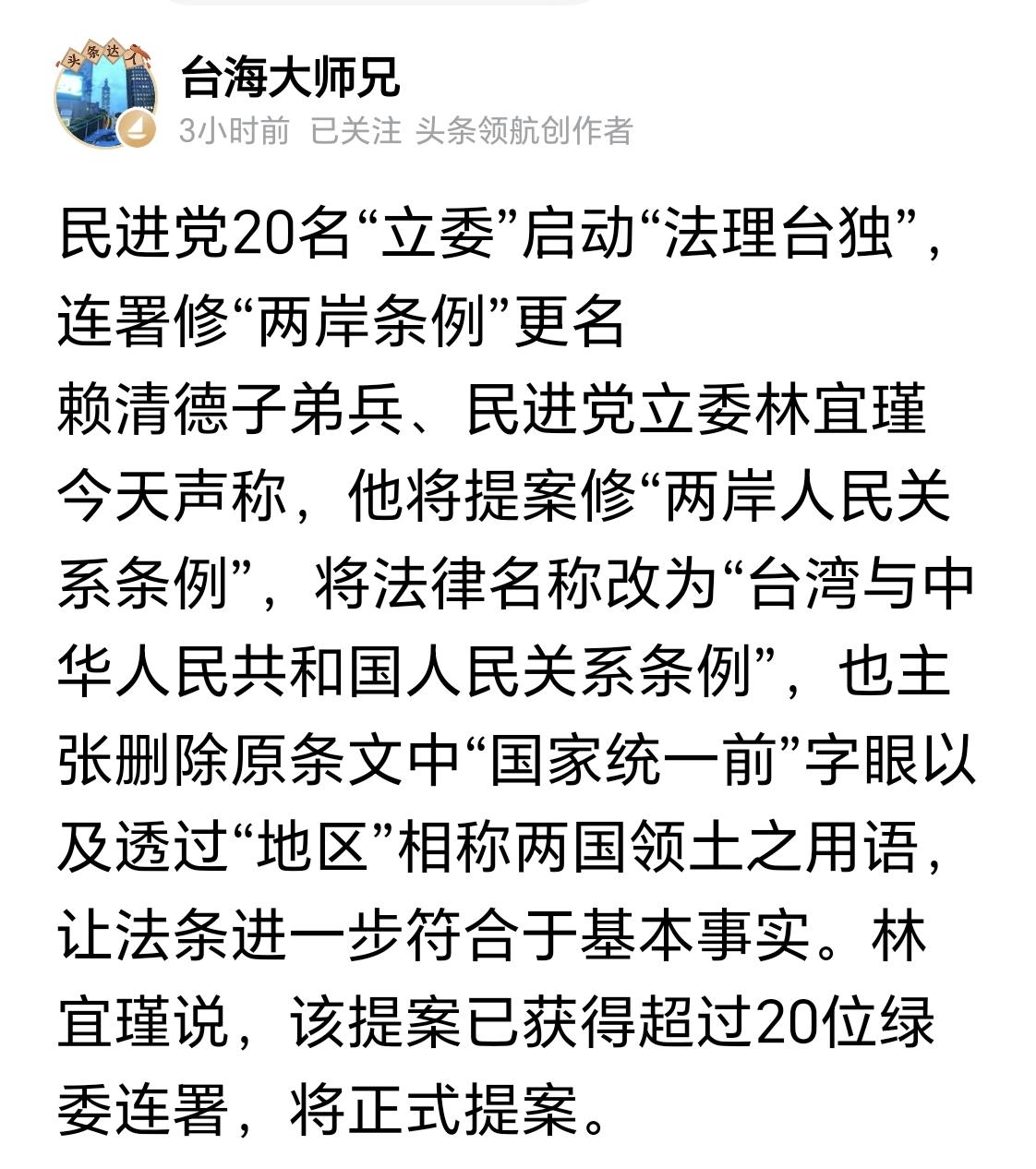一个危险信号炸响台海!民进党立委林宜瑾抛出疯狂修法提案,删“国家统一前”、改“地区”为“两国领土”,真敢落地?《反分裂国家法》的红线可不是摆设! 民进党立委林宜瑾之流,竟敢把《两岸人民关系条例》篡改为《台湾与中华人民共和国人民关系条例》,还妄图抹去“国家统一前”的表述,将“地区”偷换概念成“两国领土”! 别被他们的嚣张气焰唬住!这不过是个别政客博出位、刷声量的政治操弄! 他们心里比谁都明镜似的:这提案真敢通过,就是公然触碰《反分裂国家法》红线,直接引爆动武条件——这般滔天大祸,民进党当局压根承受不起! 说白了,就是一场过过嘴瘾的政治表演,最后注定是竹篮打水一场空! 红线碰不得,玩火必自焚!民进党这出闹剧,该收场了!