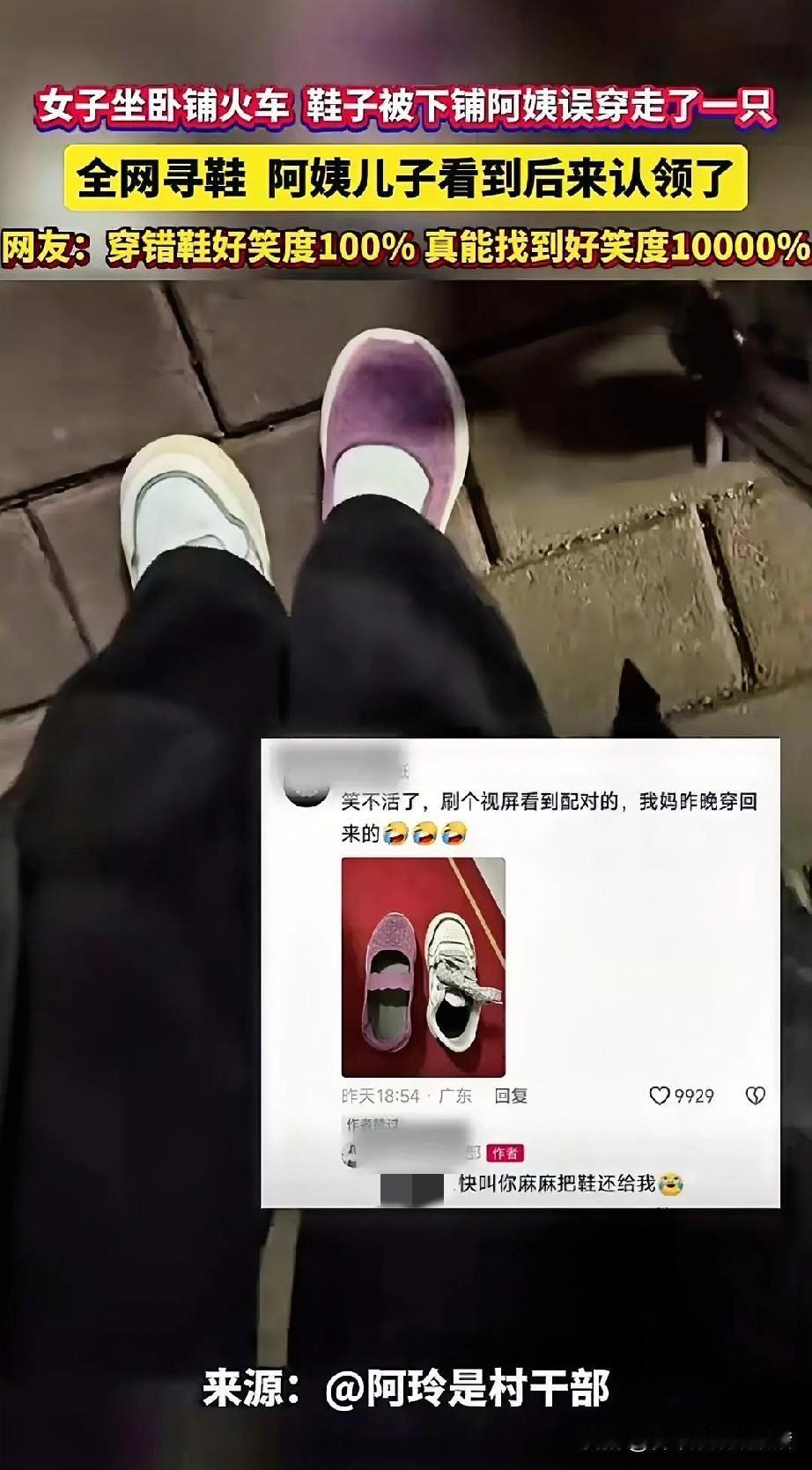 巧到家了!女子坐火车卧铺,到站下车时却发现自己的鞋子少了一只,与此同时,旁边多了一只陌生鞋子,女子转眼一想,就知道咋回事了。 原来她是上铺,下铺是一位阿姨,极有可能是阿姨急着下车,慌乱之中穿错了一只。 后来她就试着拍了个视频,把这事发到网上,希望阿姨看到后联系她,把鞋子调换过来。 本来也没抱多大希望,可没想到阿姨的儿子刚好看到了视频,相互联系后算是把鞋子换了过来。 不得不说,就这一件小事,算是把自媒体的好处真真实实体现了出来,这要搁以前,几乎是不可能再找到对方了。 但我好奇的是,两双不同颜色、不同款式、不同厚度的鞋子,阿姨穿的时候感觉肯定不一样,况且肯定要低头看一下鞋的,怎么就穿错了呢? 正所谓大千世界,无奇不有。只有自己想不到的,没有别人做不到的,啥稀奇事儿都能碰得到。 大家说是吧? 内容来源:桂林生活网 广东