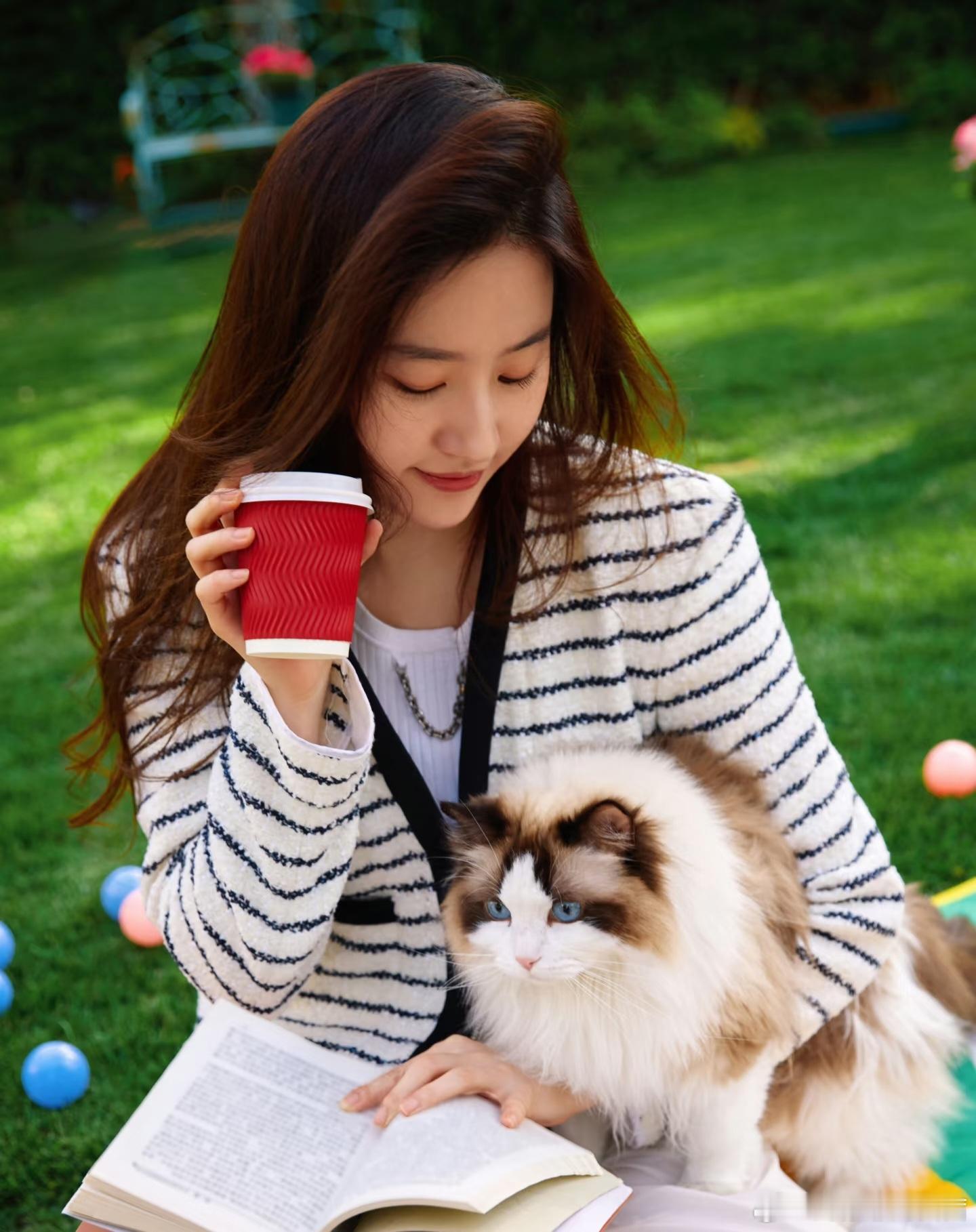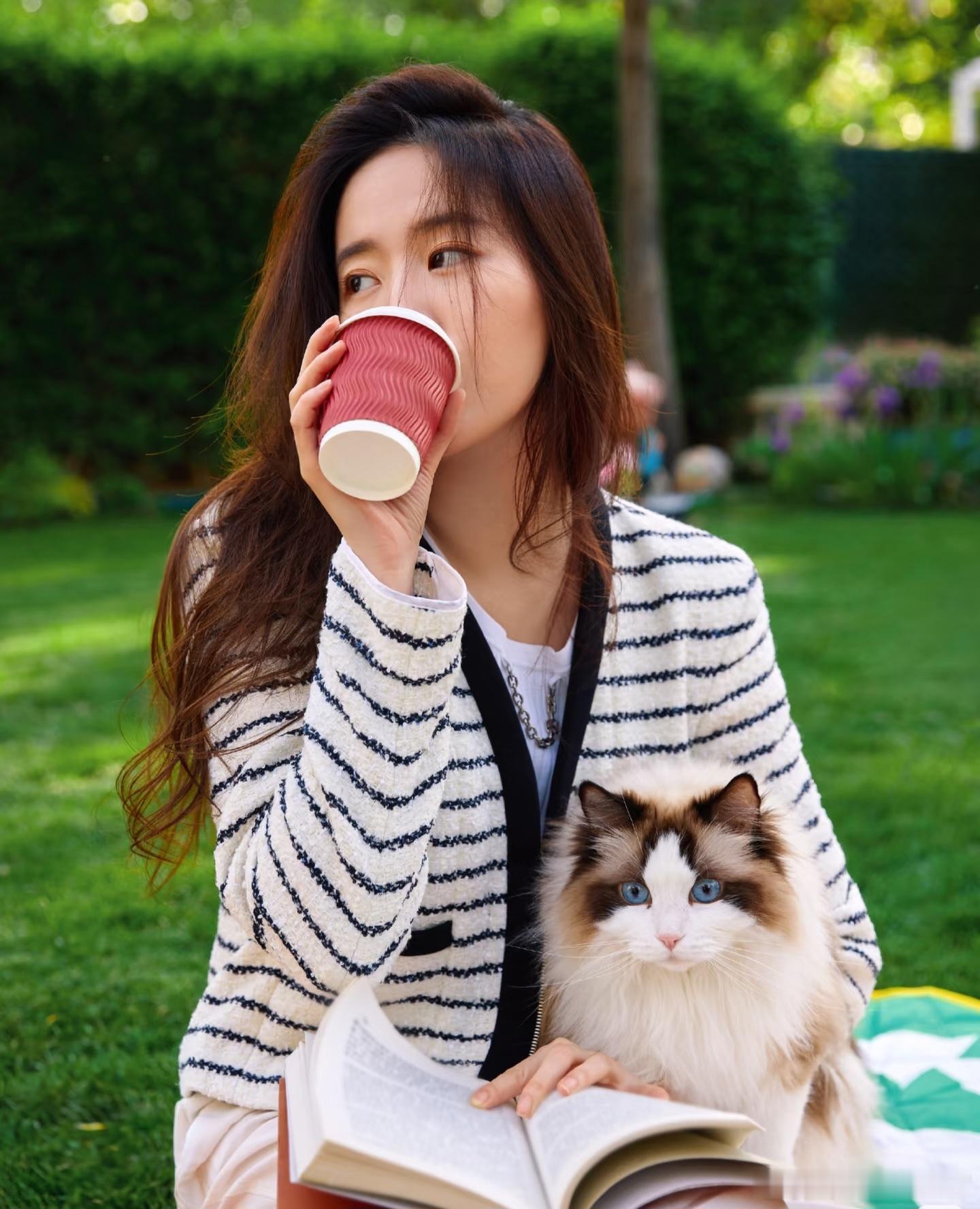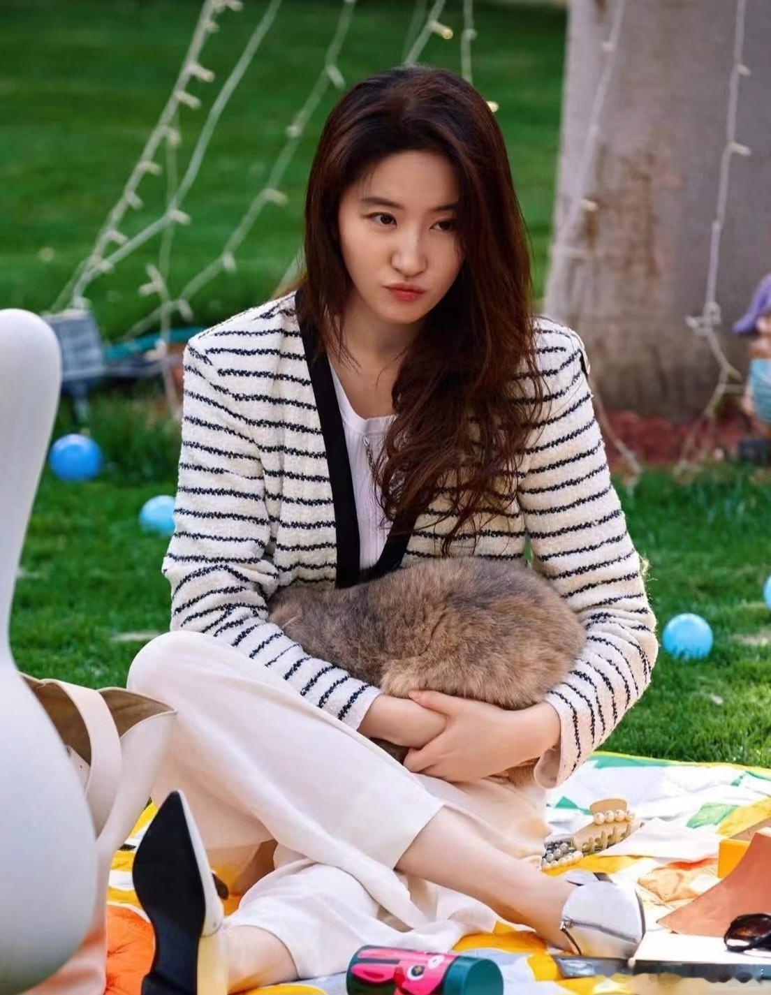 刘亦菲的穿搭无疑成为了焦点。她身着一件黑白条纹小香风针织开衫,经典的条纹元素搭配黑色包边,尽显法式名媛的精致格调。内搭简约白衫,清爽又大方。下装则是一条米白色宽松长裤,垂坠的面料让整体造型显得松弛又自在。与草坪上的彩色野餐垫、气球、书籍等元素相映成趣,仿佛一幅美丽的画卷。她怀抱着猫咪,或是轻举纸杯抿饮,或是低头与猫咪温柔对视,每一个动作都透露出慵懒随性的度假感。微卷的长发自然散落,妆容淡雅清透,娇憨的抿嘴神态、温柔的眼神互动,更是将优雅温婉的气质展现得淋漓尽致。宛如一位在花园中享受慢时光的法式优雅少女,既有小香风的精致感,又不失与自然相融的松弛慵懒。刘亦菲的这组草坪野餐照,真是把法式优雅与慵懒休闲诠释得淋漓尽致。刘亦菲刘亦菲