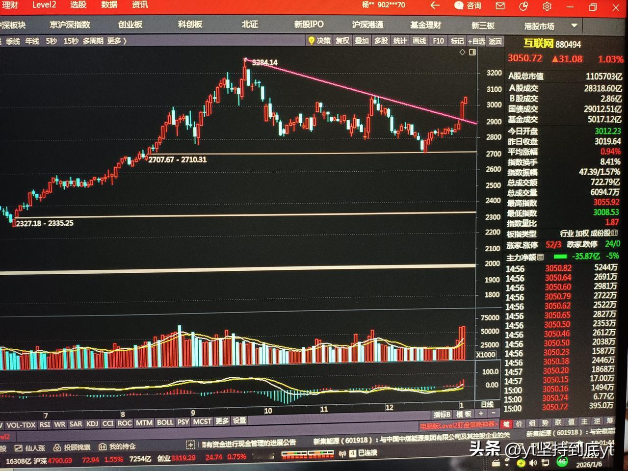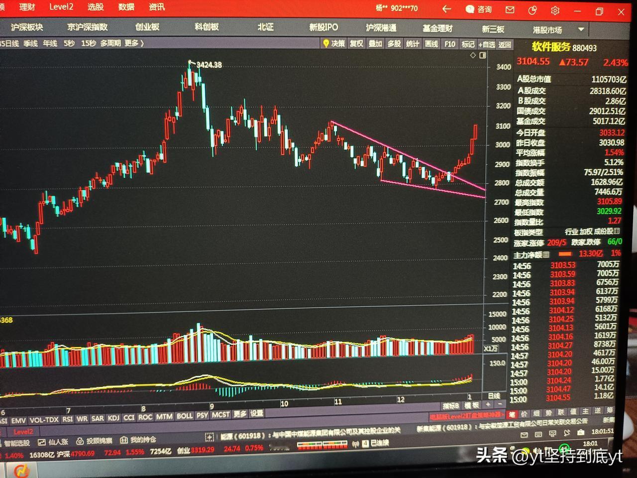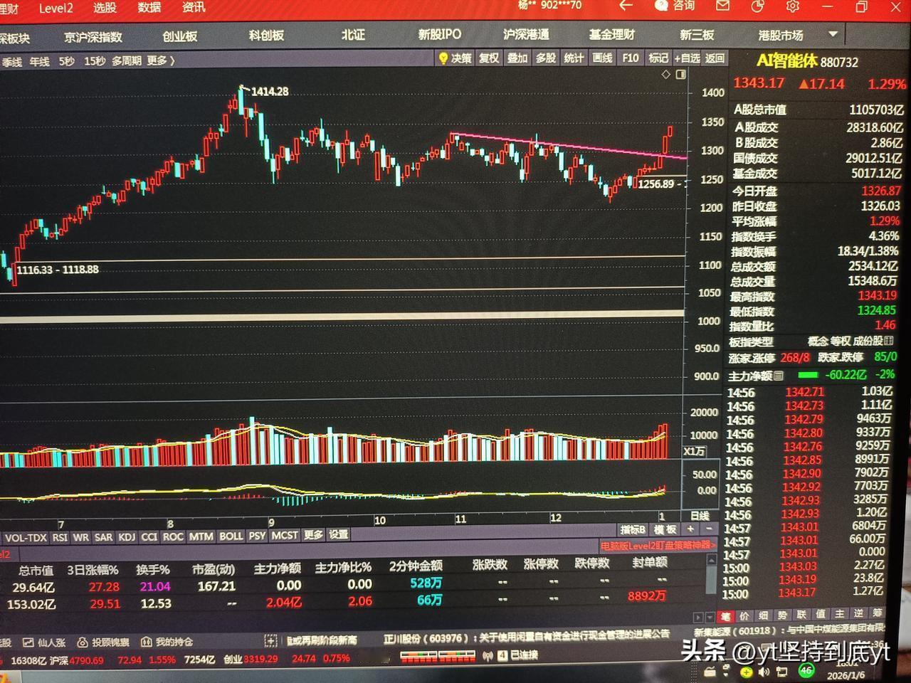 今天指数再次大涨60个点,收在4083,量能也放大到2.8万亿。这关键的一点就是,券商在今天收出个近4%的大阳线。 之前所提到的软件服务和互联网,在昨天和今天也都是出现了中阳线。现在的上涨明显都是前期在低位盘整多日的板块。 证券这个板块也是沉寂了多日,今天爆发,那么向上打开空间压力位在1950点。离这里还有100多点的空间。 之前一直提到的1月5号的时间点,看来是一个变盘向上,并产生跳空缺口。今日的大阳线看来就是一个突破性的缺口。上证指数明天看来会有一定的震荡,但不妨碍后面会继续创出新高。 现在指数向好,可以积极的布局在还没有起涨的底部结构形成的股票上。同时,AI应用方面盘中有回调,可以介入。