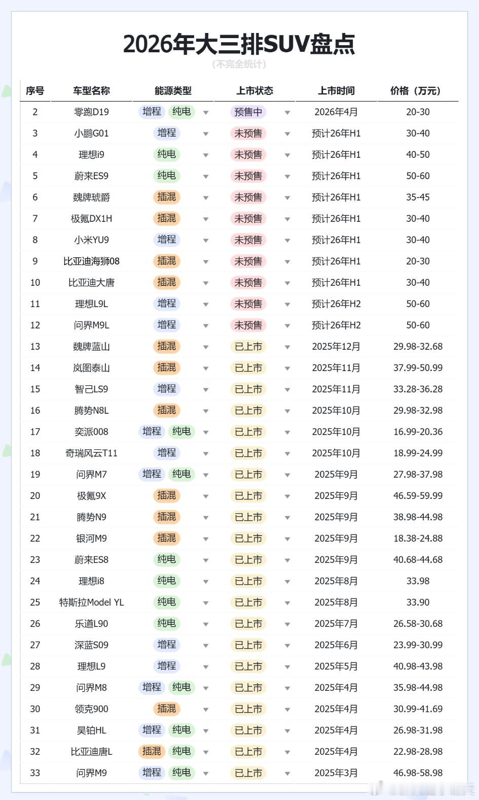 在整理「2026 三排大 SUV 盘点」这张图的时候我就在想:要不咱造点小车车吧?新能源汽车大v聊车