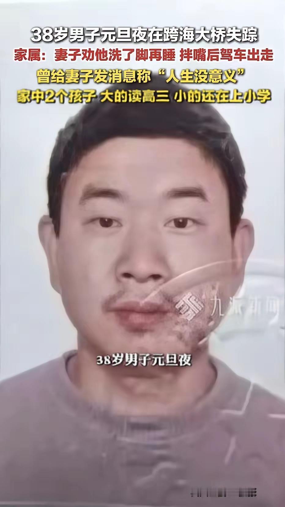 福建石狮,一38岁男子外出回家后,妻子劝他洗一个脚再睡,本来只是很寻常的一句话,可没想到男子竟然和妻子发生了争执,然后转身就摔门离开了家,妻子以为他就是心情不好出去透透气,也就没在意,可谁知,当晚男子给妻子发了一条“人生没意义”的消息后,就没了踪影。 有网友表示:男子的行动只能用“脆弱”两个字来形容,别说只是妻子的一句“洗了脚再睡”,就是夫妻间打一架,大吵一顿,也应该该放下时就放下,何心如此的让家人们担心呢?我想男子是一时之气躲开了,真要是在跨海大桥上做出其它绝决的举动,那可真是太不应该了。但愿他想开了就赶紧回家吧。 也许是太累了,也许有很多委屈,也许是太多的无赖,也许是关心的人太少了,不管怎样,男人是家里的顶梁柱,要拿得起放得下,你要想一想,家里有老人,妻子,还有你的宝贝孩子,还有你的兄弟姐妹,他们都在等你安全回来。 当下是生活压力最大的时候,家人理应理解包容,回家给个微笑,一句暖心话可能化解一天劳累。很怀念小时候家里虽穷,但冬天大人在太阳下打牌的幸福时光。现在物质丰富了,可生活压力山大。 其实不是妻子的那句唠叨,是现在的人压力太大,心里总有疙瘩,冰冻三尺,非一日之寒!但愿人互相理解包容,再难也要向前看! 对此大家怎么看呢