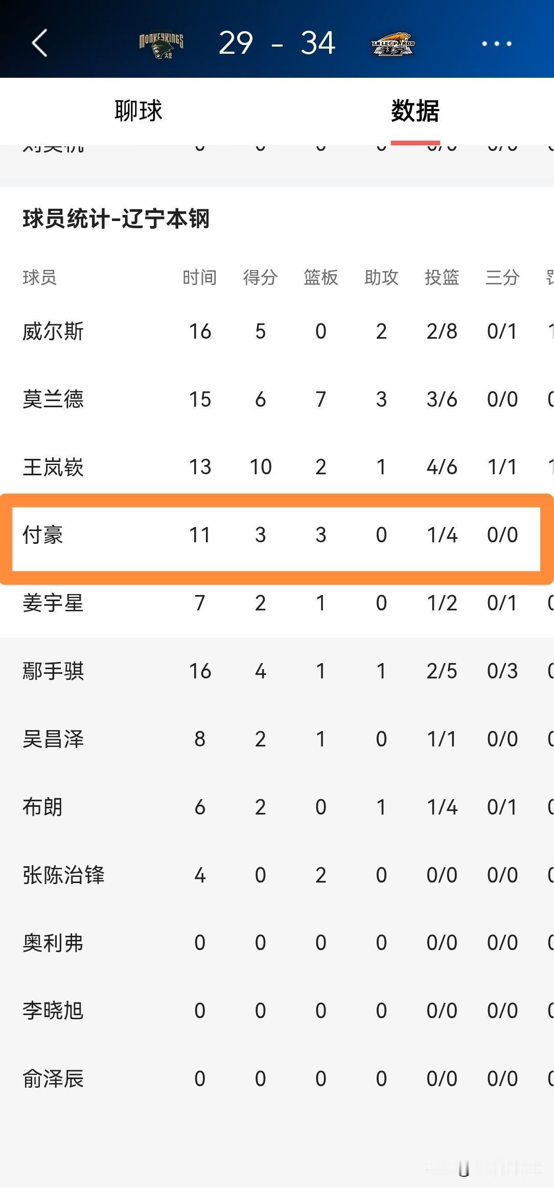 我忍不住要怒批辽宁本钢球星付豪,他的状态真是太低迷了!在今天辽宁本钢客场挑战南京天之蓝的上半场比赛中,付豪在进攻端显得非常低迷,他在首发出战的11分钟里,投篮4中1,其中罚球2中1仅仅得到3分,还出现了1次失误。 毫不夸张的说,如果付豪继续在下半场比赛中低迷的话,辽宁本钢很有可能会输掉本场比赛。