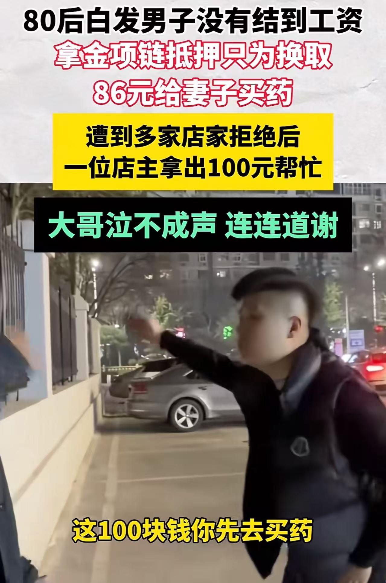 看哭!40岁白发男子给妻子买药差86块钱,拿金项链抵押,可是遭到多家店主拒绝。就在男子快要绝望的时候,一位好心的店主大哥给了他100元,还说不需要男子抵押项链,就算被骗了他也认了…… 男子才40岁,却满头白发,满脸疲惫。这天,妻子身体不舒服,可男子因为工资被拖欠,实在拿不出钱给生病的妻子买药。情急之下,他打算把结婚时买的金项链先抵押。 可现实比想象更冷。他接连走进好几家金店、便利店,甚至小超市,低声下气地问:“能不能借我86块?我拿项链抵押……” 但换来的却是别人怀疑的眼神、甚至有人直接说:“别演了,谁知道你这链子是真是假?” 他站在街头,几乎要放弃。可一想到妻子在家难受的样子,他又咬咬牙,走进最后一家小店。 店里坐着一位中年店主大哥。男子声音颤抖地说:“大哥,能借我86块钱吗?我老婆病了,就差这点钱买药……我可以把项链押给你。” 店主愣了一下,男子要的不是100,不是80,而是86块,有零有整。这让他十分好奇男子到底要这笔钱做什么。 于是,大哥问道:“你要钱干嘛呢?” 男子解释说:“我老婆生病了,我要给她买药,还差86块钱……我找了很多家店,他们都不相信我。” 大哥愣了一下,没想到是这个原因。可这却让男子以为大哥也不愿意,又接着说:“你也可以直接帮我买药的,我不要钱,可以吗?” 看着男子满头的白发和疲惫的神情,大哥心里一阵心酸。他坚定地说:“我不需要你抵押,我相信你,我给你100块钱,就算被骗了,我也认了。” 说着,大哥迅速把钱塞到男子手里,拍了拍他的肩膀说:“这钱你先去买药!别耽误了!” 男子瞬间感动得热泪盈眶,他哽咽着,不停地说:“谢谢,谢谢,算我借你的。三天后还你……” 【评语】 一个男人,为86块钱低声下气求人,连抵押金项链都无人敢接——不是大家没能力帮,而是宁愿错杀一百,也不愿相信一次。 我们防诈骗防到连善意都不敢释放,宁可让真正需要帮助的人在寒风中绝望,也不愿承担那万分之一的“被骗”风险。这不该是一个正常社会的逻辑。 当一个人连86块钱都借不到,不是他不够体面,而是我们的善意太吝啬。 这位店主大哥用他的善良和信任,为我们上了一堂生动的课。他没有被世俗的偏见所左右,没有被可能被骗的风险所吓倒,而是选择相信一个陌生人,伸出援手给予帮助。 这种无私的爱和纯粹的善良,就像黑暗中的一道光,照亮了我们的心灵,让我们感受到了人性的温暖和美好。 真正的文明,不在于高楼有多高,而在于一个走投无路的人,还能不能在街角遇到一个愿意递给他100块钱的大哥。