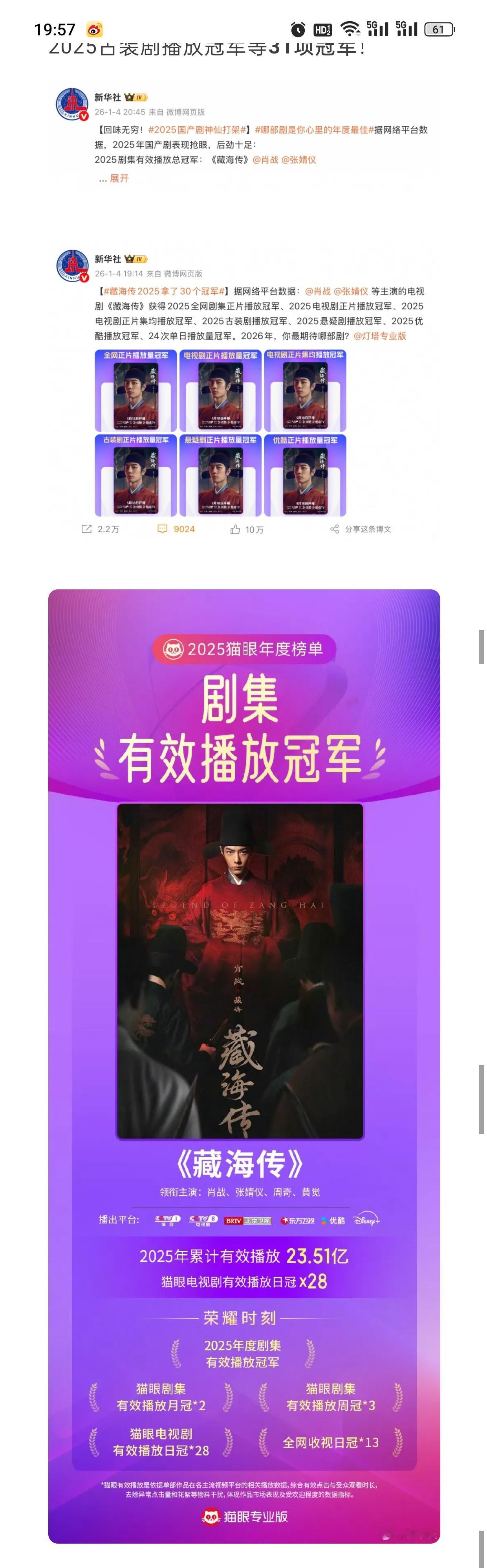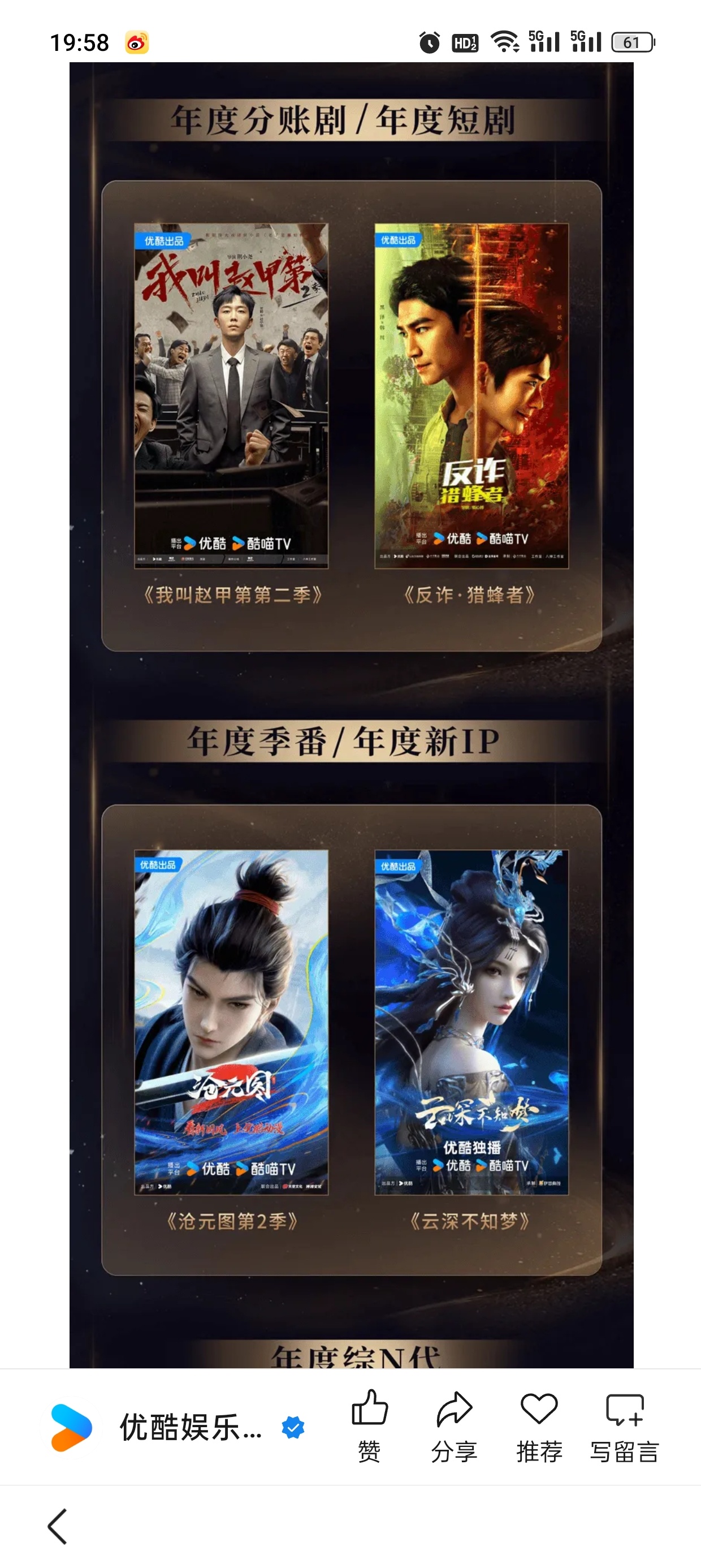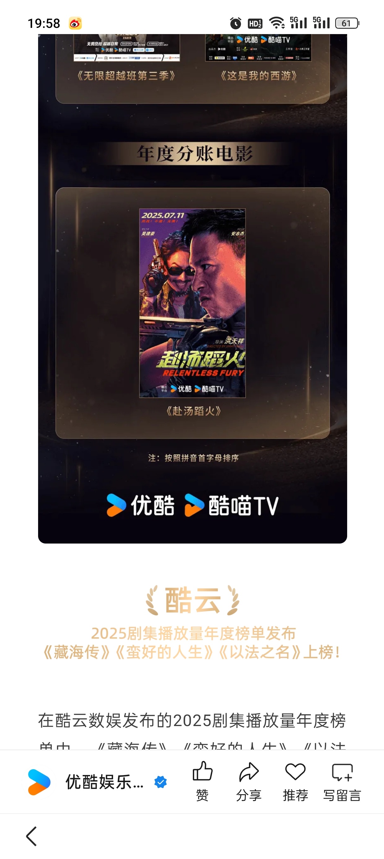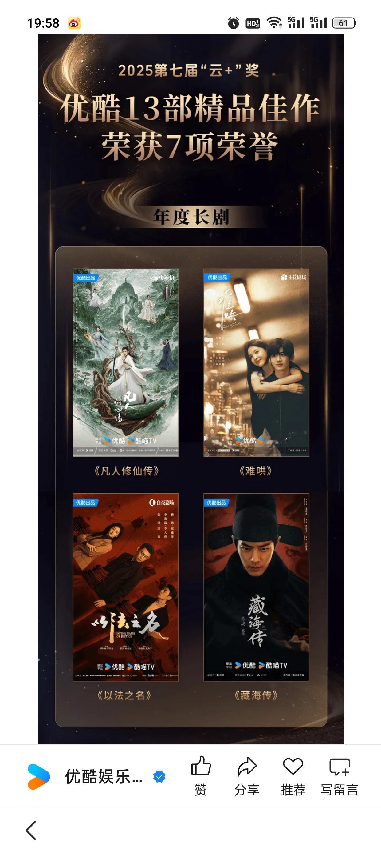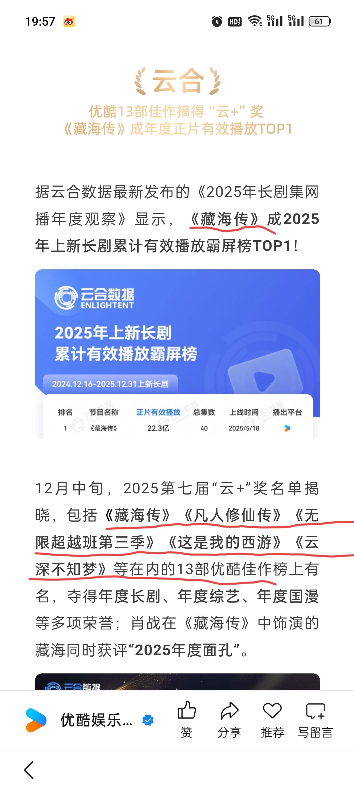 优酷刚发的25年总结盘点,大篇幅夸《藏海传》剧王,剩下夸其他剧,就是没有《长安二十四计》 IE只能自嗨吹假币