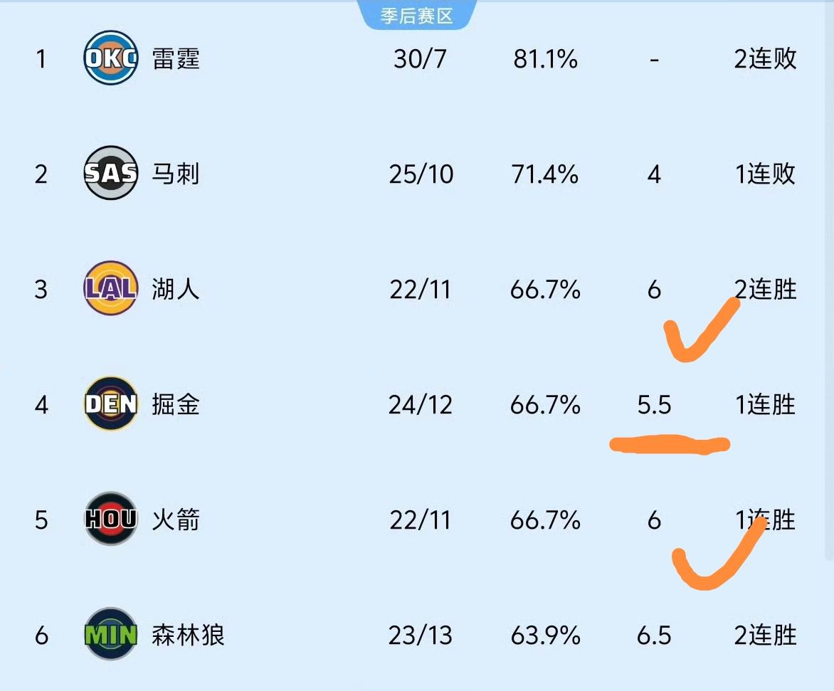 刚看NBA,这点我看不懂。掘金险胜76人后,跟西部第一的雷霆胜场差是5.5,湖人跟雷霆的胜场差是6,那么掘金排名不应该在湖人之上吗? 湖人和火箭跟雷霆的胜场差都是6,但因为相互战绩湖人占优,所以湖人排名在火箭之前。