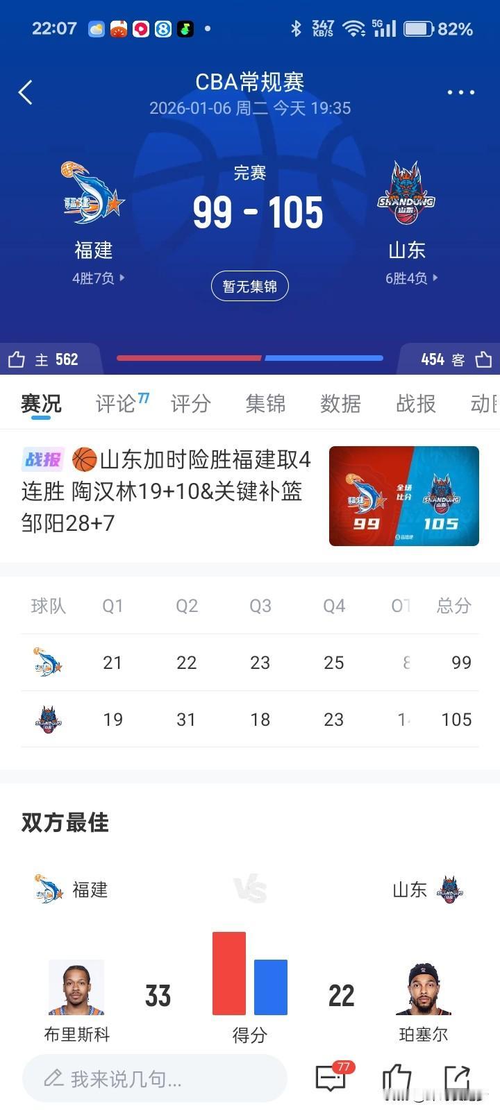 恭喜山东4连胜!太不容易了!今天这比赛看的一波三折!幸亏是凯撒以前是执教过山东的!最后时刻也帮助了山东!不过今天福建的邹阳今天确实厉害!差点就输给了福建!不的不说这个助理教练可以啊。敢用陈培东!厉害!前三节半一分钟不上,最后5分钟上他,第一投打铁!第二投关键三分!牛逼!还有谢志杰第四节没有你,这比赛哪有加时赛!今天陶汉林也是打的最好,于德豪也开了,山东慢慢走向正轨!山东男篮 山东男篮CBA 山东男篮外援 齐鲁男篮 山东外援克里斯