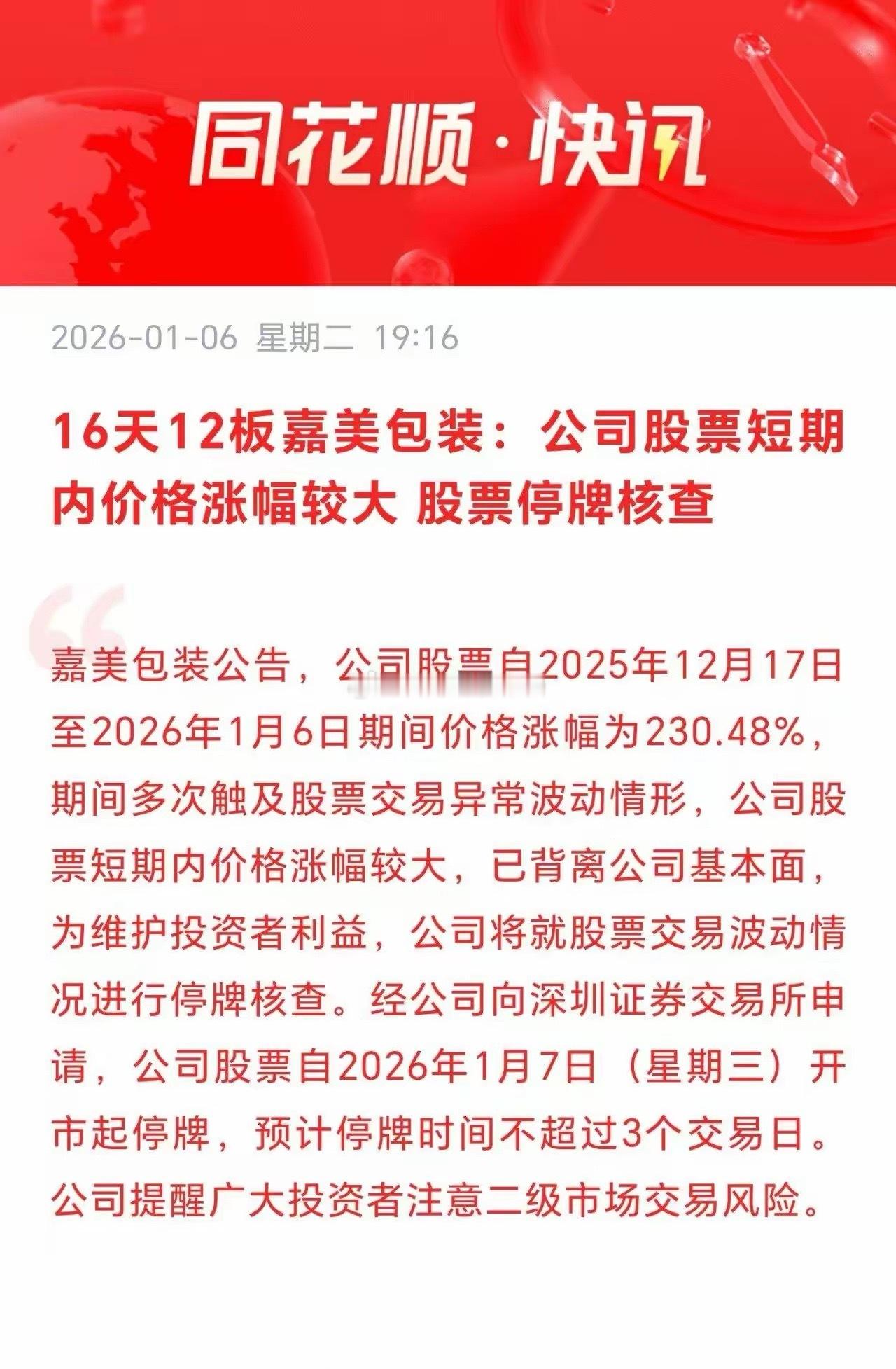 完犊子!刚刚一个晚上两个抱团高标集体申请停牌了,这释放了什么信号?刚刚两个抱团高标个股,嘉美包装,国晟科技,集体宣布停牌。其中嘉美包装是16天12个涨停板,国晟科技则更猛了,底部上来直接7倍了。理由基本都是一样,因公司股票短期内股价涨幅较大,存在市场情绪过热、非理性炒作风险,存在股价短期快速回落风险。为维护广大投资者利益,根据相关规定,申请停牌。一个晚上两个抱团高标集体申请停牌,我想这对外释放的信号已经很清楚了!就是要打压这种不理性的,毫无逻辑的炒作。现在的市场可以说典型的两边倒,一边是这种抱团个股,疯了一样的不断数板,一边则是各种老登股不断下坠。这样的市场明显是有问题的。像刚刚申请停牌的国晟科技、嘉美包装,有业绩吗?有成长性吗?有拿得出手的真家伙吗?答案显然是没有。那为什么这么猛?不就是某些资金集体炒作吗?搭上点概念疯狂抱团吗?只要天花板够高,就自然而然的把那些散户吸引过来,高位接盘。所以打击抱团高标是好事!希望明天那些抱团的高标能熄熄火!