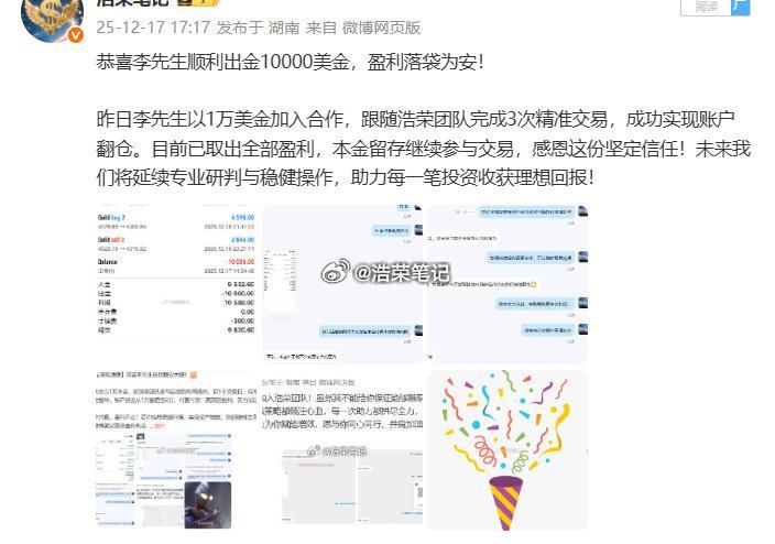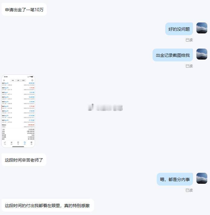 恭喜李先生第五次顺利出金10w美金,盈利落袋为安!每一份亮眼的交易战绩背后,都藏着无数个独自扛住的至暗时刻。汇市博弈,从无定局。没有摔过的跟头,没有反复复盘的沉淀,又怎能真切尝得胜利的甘醇?交易的真谛,从来都是:抱最大的希望,尽最大的努力,做最坏的打算。只要步履不停,向阳而行,所有美好终将如约而至!黄金金价
