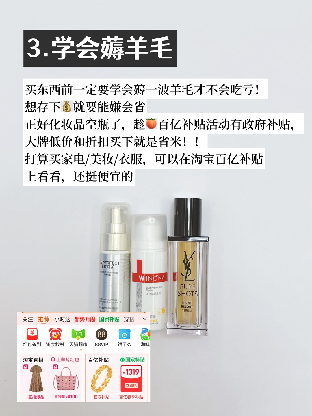 大家好[派对R],这里是努力搞钱,存到百万就退休的小猫👋 月薪 3000 元可能只够维持基本的生活开销,但其实只要合理规划,也能把日子过得很滋润,每年还能攒下钱[害羞R] 1️⃣每月花销 2️⃣花小钱上班 3️⃣学会薅羊毛 买东西前一定要学会薅一波羊毛才不会吃亏! 想存下💰就要能嫌会省 正好化妆品空瓶了,趁淘宝百亿补贴活动有政府补贴,大牌低价和折 扣买下就是省米[赞R]!! 打算买家电/美妆/衣服,可以在淘宝百亿补贴上看看,还挺便宜的 4️⃣花小钱吃喝 5️⃣物品用基础款 6️⃣花小钱提升自我
