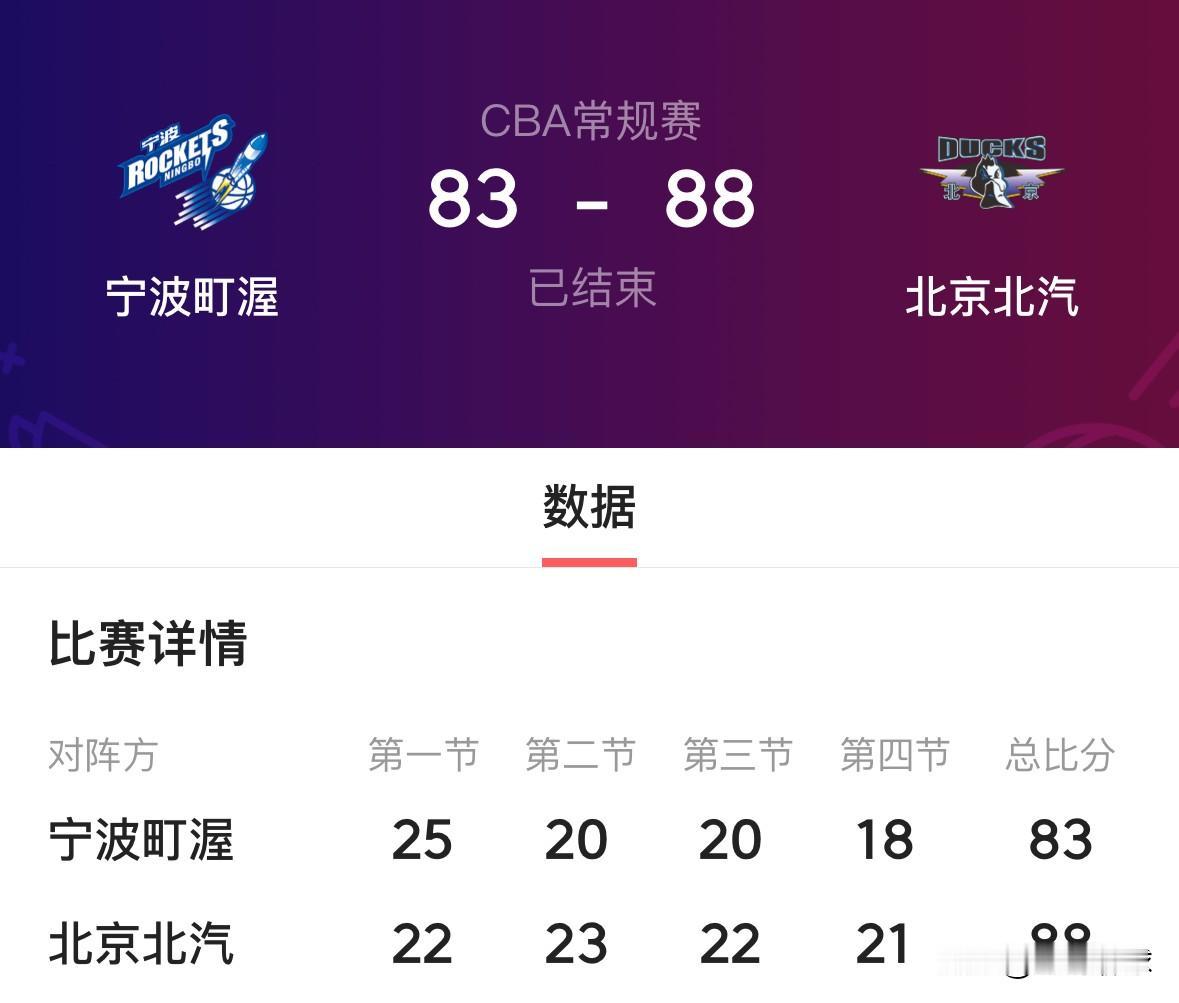 北京首钢88:83险胜宁波!本场比赛,北京核心球员赵睿因伤缺席比赛,双方在一开始就展开了疯狂拉锯战,上半场结束45平,前三节战罢北京首钢仅靠2分优势进入第四节,第四节一上来宁波就开启了反扑攻势,最后1分半83平,依靠周琦罚球将比分反超,随后陈盈骏接连罚球重新取得领先优势,最终以88-83险胜宁波,宁波则遭遇2连败。
