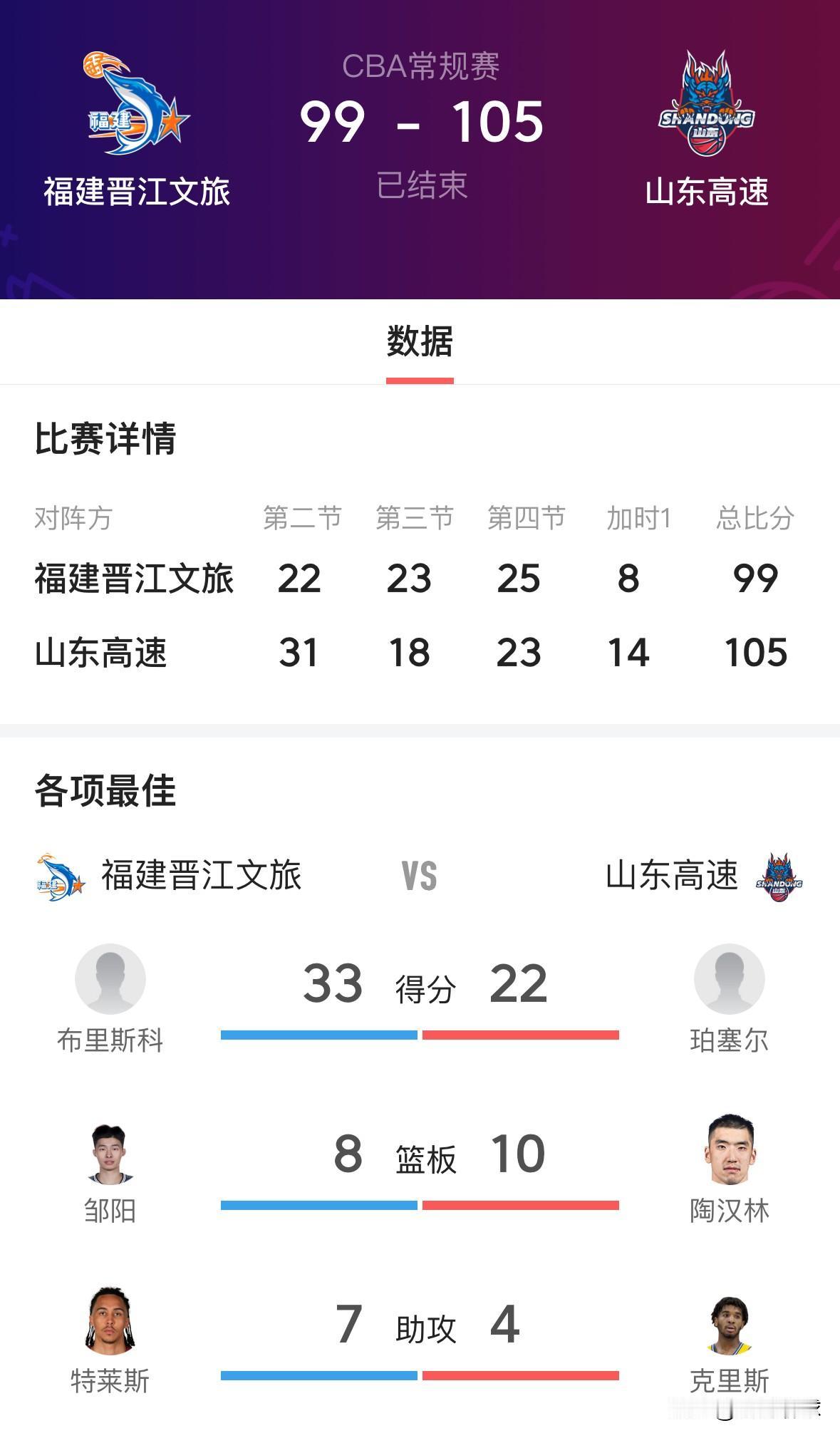 山东高速男篮四连胜!!! 本场比赛山东高速主教练邱彪因上场缘故停赛2场,本场继续由助教带队,山东高速经过加时赛以105:99击败福建晋江,豪取四连胜。 本场陶汉林表现出色,9投8中,砍下19分10篮板,大外援克里斯早早进入了犯规危机,珀塞尔拿下22分!