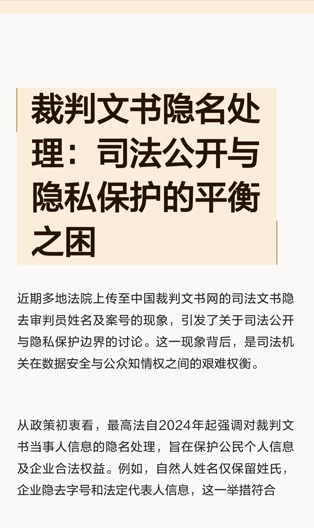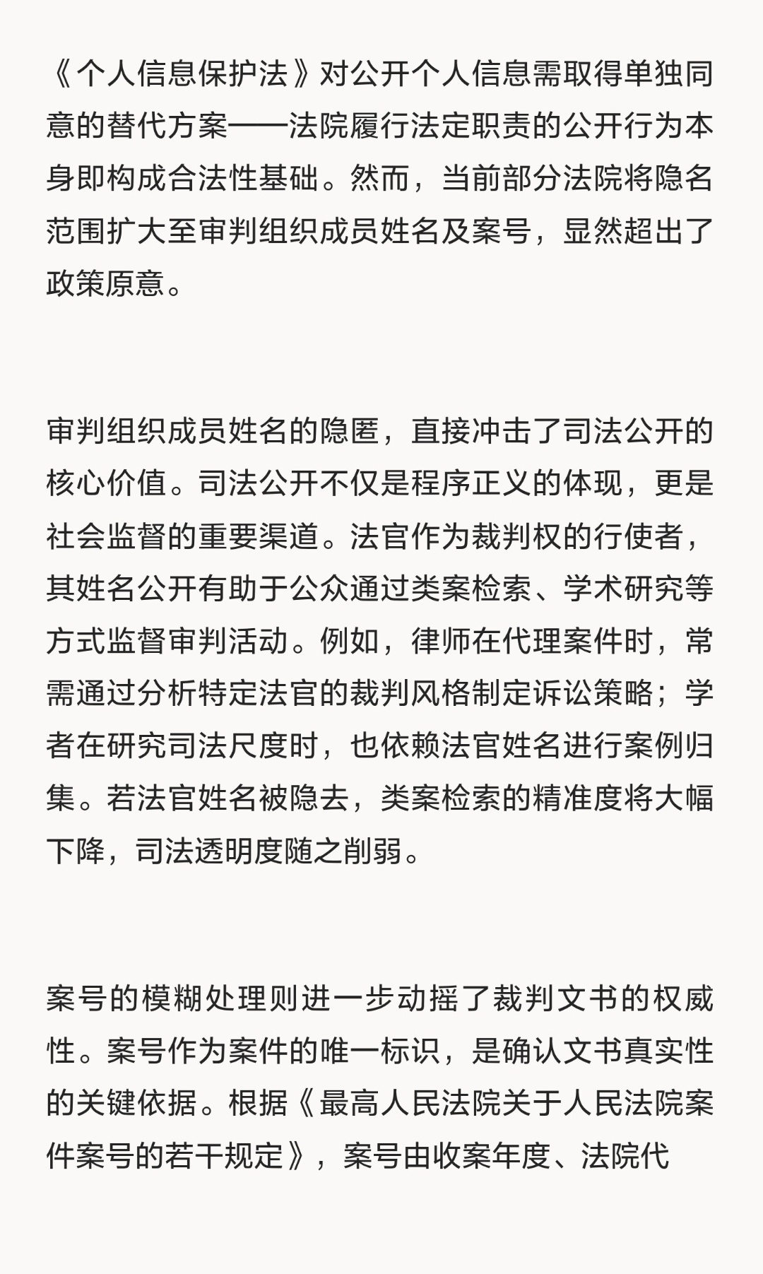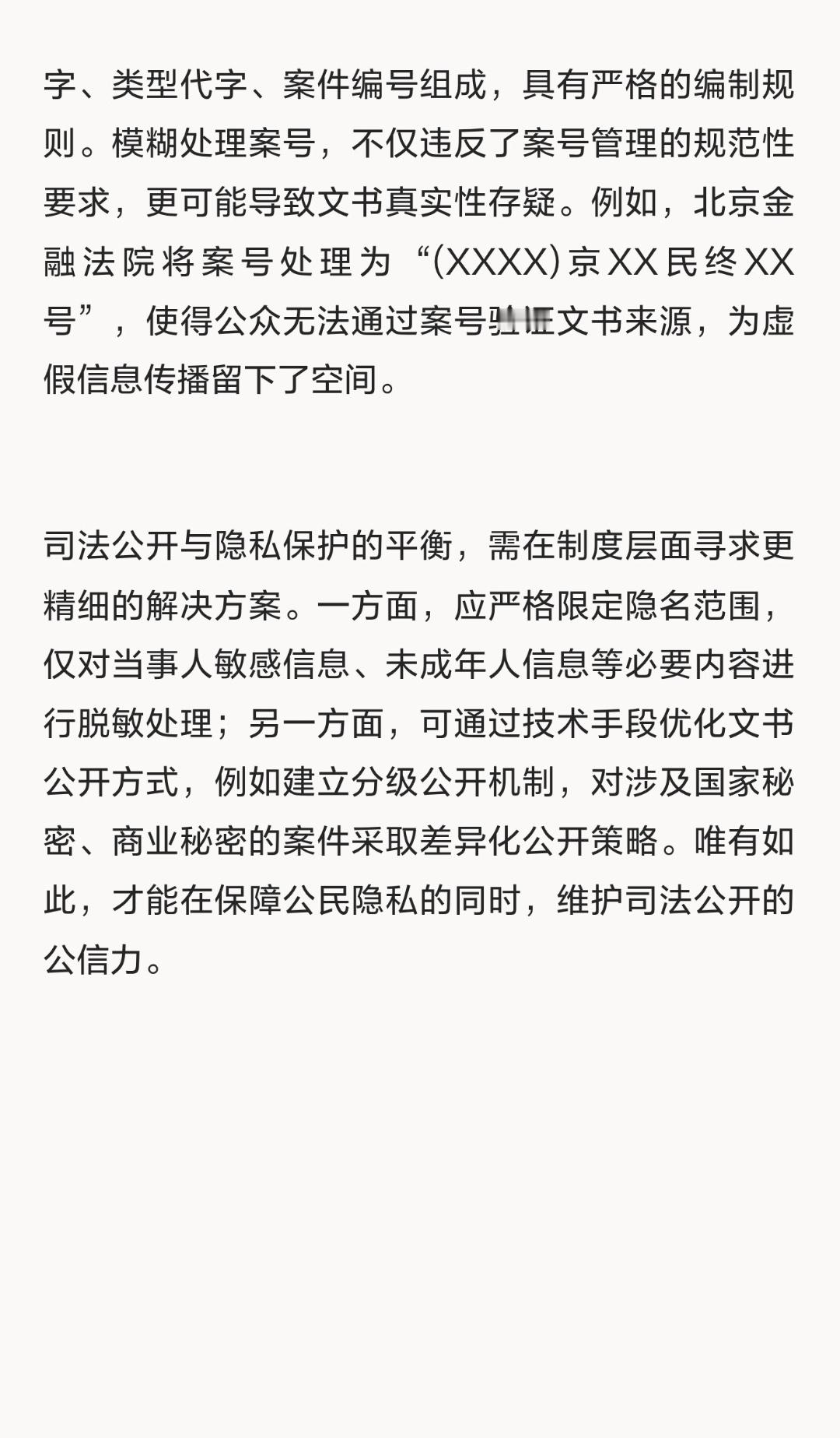 | 近期多地法院上传至中国裁判文书网的司法文书隐去审判员姓名及案号的现象,引发了关于司法公开与隐私保护边界的讨论。这一现象背后,是司法机关在数据安全与公众知情权之间的权衡。从政策初衷看,最高法自2024年起强调对裁判文书当事人信息的隐名处理,旨在保护公民个人信息及企业合法权益。例如,自然人姓名仅保留姓氏,企业隐去字号和法定代表人信息,这一举措符合《个人信息保护法》对公开个人信息需取得单独同意的替代方案——法院履行法定职责的公开行为本身即构成合法性基础。然而,当前部分法院将隐名范围扩大至审判组织成员姓名及案号,显然超出了政策原意。审判组织成员姓名的隐匿,直接冲击了司法公开的核心价值。司法公开不仅是程序正义的体现,更是社会监督的重要渠道。法官作为裁判权的行使者,其姓名公开有助于公众通过类案检索、学术研究等方式监督审判活动。例如,律师在代理案件时,常需通过分析特定法官的裁判风格制定诉讼策略;学者在研究司法尺度时,也依赖法官姓名进行案例归集。若法官姓名被隐去,类案检索的精准度将大幅下降,司法透明度随之削弱。案号的模糊处理则进一步动摇了裁判文书的权威性。案号作为案件的唯一标识,是确认文书真实性的关键依据。根据《最高人民法院关于人民法院案件案号的若干规定》,案号由收案年度、法院代字、类型代字、案件编号组成,具有严格的编制规则。模糊处理案号,不仅违反了案号管理的规范性要求,更可能导致文书真实性存疑。例如,北京金融法院将案号处理为“(XXXX)京XX民终XX号”,使得公众无法通过案号验证文书来源,为虚假信息传播留下了空间。司法公开与隐私保护的平衡,需在制度层面寻求更精细的解决方案。一方面,应严格限定隐名范围,仅对当事人敏感信息、未成年人信息等必要内容进行脱敏处理;另一方面,可通过技术手段优化文书公开方式,例如建立分级公开机制,对涉及国家秘密、商业秘密的案件采取差异化公开策略。唯有如此,才能在保障公民隐私的同时,维护司法公开的公信力。