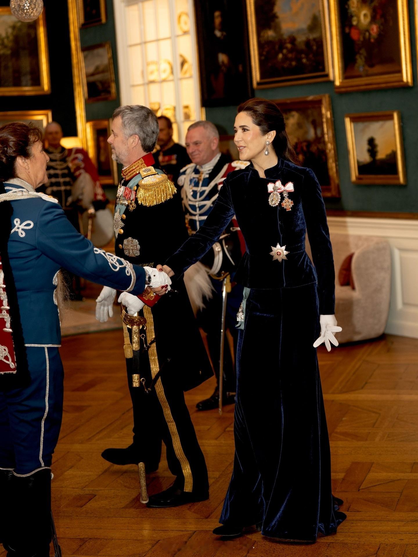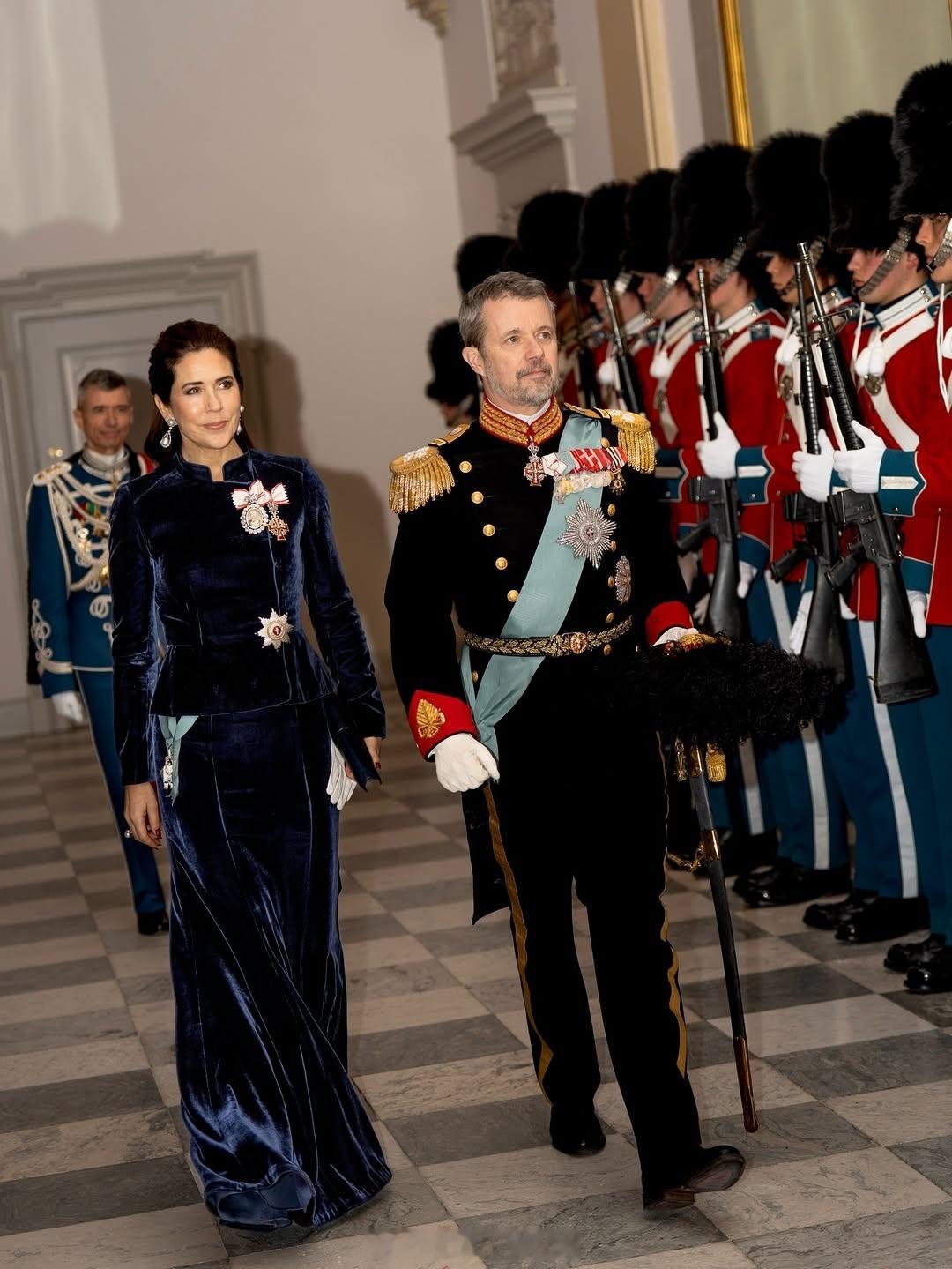 1.5丹麦国王腓特烈十世和王后玛丽出席第二场新年接待会,长袖天鹅绒礼服就很适合