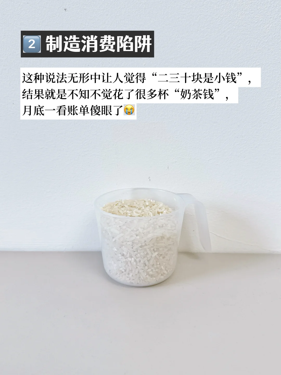 这种说法无形中让人觉得“二三十块是小钱”,结果就是不知不觉花了很多杯“奶茶钱”,月底一看账单傻眼了😭