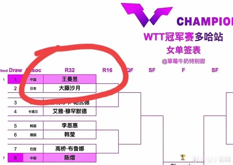 没想到吧,王曼昱打了这么多年乒乓球,她与大藤沙月从来没有在国际赛事中有过单打交手记录,只是在双打赛场有过几次交手。2025年成都混团世界杯,王曼昱搭档蒯曼,战胜张本美和/大藤沙月组合,2025年WTT欧洲大满贯瑞典站女双决赛:孙颖莎/王曼昱与张本美和/大藤沙月组合对决,最终3 - 2获胜夺冠。至于单打,王曼昱和大藤沙月没有交手过。这次2026年WTT多哈冠军赛,两人将迎来职业生涯首次单打交锋。所以说,这场比赛是一场充满悬念的比赛。大藤沙月实力不容小觑。对于大藤沙月和王曼昱来说,都是对对方充满期待的。不过以王曼昱的实力,只要发挥正常,完全没有问题。同时也要做好充分准备。这是一场非常值得期待的比赛。让我们祝王曼昱旗开得胜,马到成功!