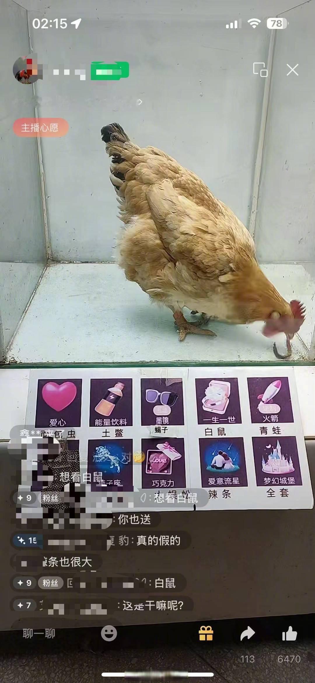 【直播间打赏千元给鸡投喂活老鼠】鸡吃老鼠青蛙直播间引虐待争议近日,有网友向封面新闻 反映,部分直播平台出现一系列以“打赏投喂”为噱头的猎奇直播,引发关注。根据线索,1月5日记者进入某热门直播间进行观察,发现一只鸡被关在透明笼内,镜头前清晰贴着一张“礼物投喂对照表”,列明不同礼物对应的活体食物:从“爱心”兑换面包虫、“墨镜”兑换蝎子,直至“一生一世”和“火箭”分别对应白鼠与青蛙。 直播过程中,礼物与投喂行为实时联动——每当观众送出对应打赏,便有一只来自镜头外的手将活体生物投入笼中,鸡被迫在有限空间内不断啄食,直至“礼物环节”结束。直播持续数小时,弹幕中不时出现“吃老鼠”“喂青蛙”等催促内容。 “如果有网友刷‘梦幻城堡’礼物,就意味着‘全套’投喂——这只鸡将被同时投喂面包虫、青蛙、辣条、老鼠等。” 价格方面,打赏爱心只需要1颗微豆,墨镜需要99颗微豆、巧克力需要388颗微豆,而爱意流星和梦幻城堡的价格高达5200颗和10000颗微豆。按照相关规则,7颗微豆的售价为1元,也就是说,若有人打赏梦幻城堡,则需要支付1400余元。 对此,律师表示:将动物直播作为流量与打赏工具或属于虐待范畴。