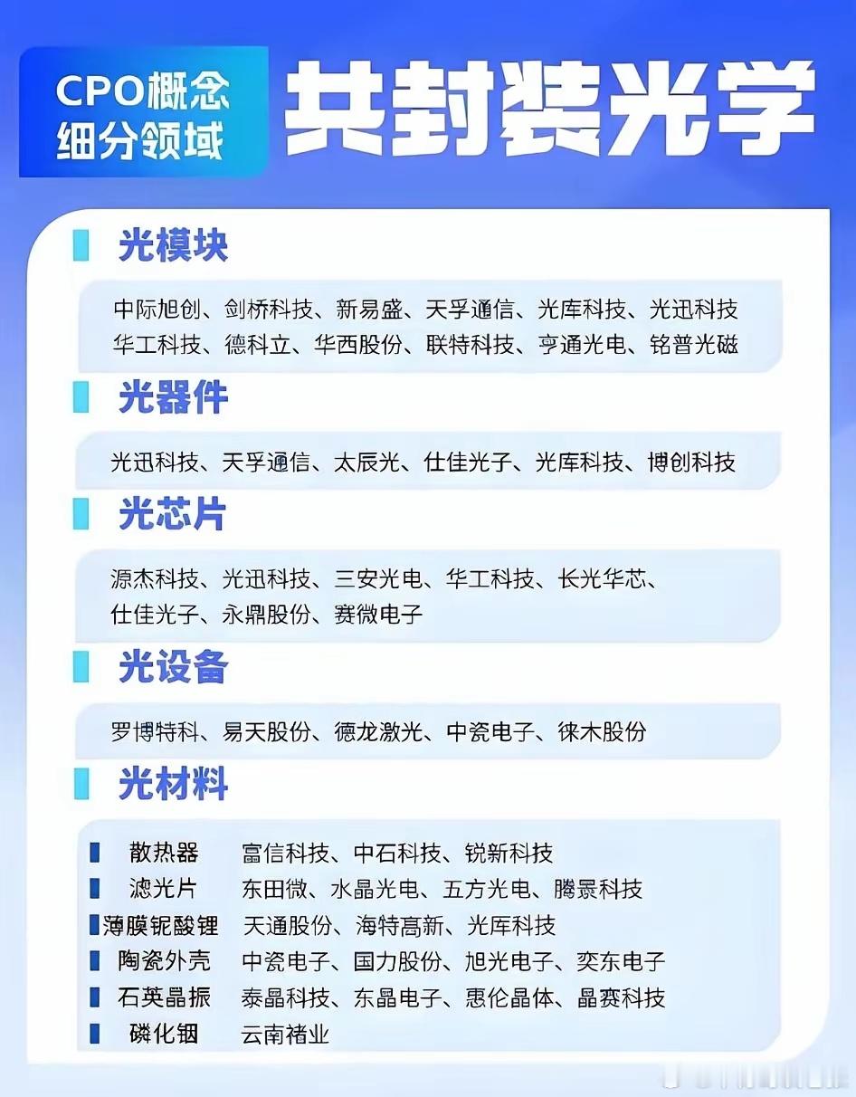 CPO共进封装光学概念梳理别只盯着AI!算力竞赛的“隐形冠军”正悄然爆发。CPO(共封装光学)才是本轮科技行情的硬件底座。它不是单一股票,而是一个完整的产业链生态。炒作逻辑很清晰:AI大模型催生算力饥渴,数据中心内部数据传输成为瓶颈,而CPO技术能将光引擎和芯片紧密集成,是突破功耗与速率极限的终极方案。产业链价值已深度传导:1. 光模块/器件率先受益,业绩弹性最大。2. 光芯片是技术制高点,国产替代空间广阔。3. 设备与材料是“卖铲人”,需求确定性高。当前市场已从概念扩散到细分挖掘。下一波炒作方向,必将围绕产业链中技术壁垒最高、份额有望快速提升的核心环节。真正的龙头,往往隐藏在材料和设备端。你看懂这个逻辑了吗?AI算力板块 CPO光电共封装概念股梳理