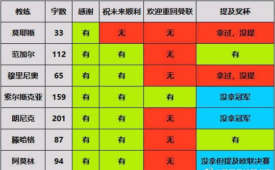 爵爷站在那,一眼望去,没有一个自己当年的影子……那个时候曼联还没意识到事情的严重性,以致沉沦至今。 图二:球迷对比了曼联历任主教练的下课官宣公告,从5个维度分析各位主帅的待遇。 综合下来,离弗爵爷最近的莫耶斯待遇最差,索尔斯克亚为二进宫埋好伏笔。