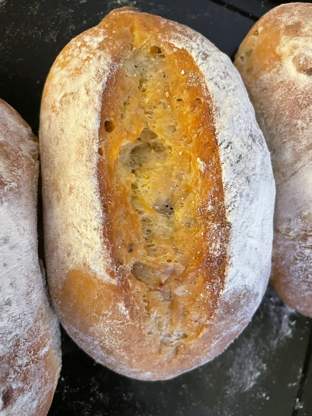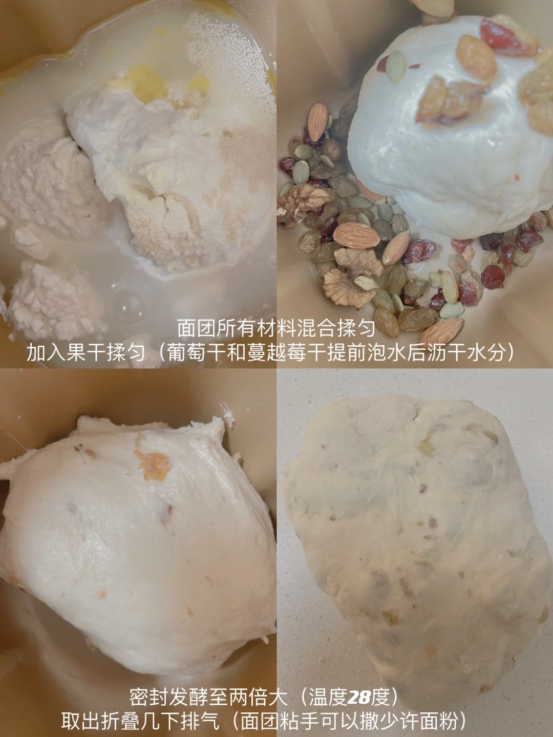 用料: 高筋面粉210克 水148克 盐2克 奶粉10克 干酵母2克 橄榄油15克 果仁60g(放自己喜欢的就可以) 表面装饰 软化黄油适量 高筋面粉适量