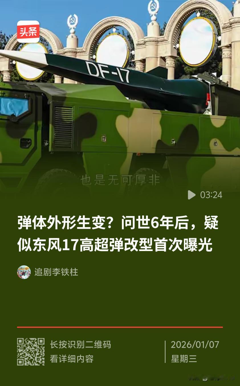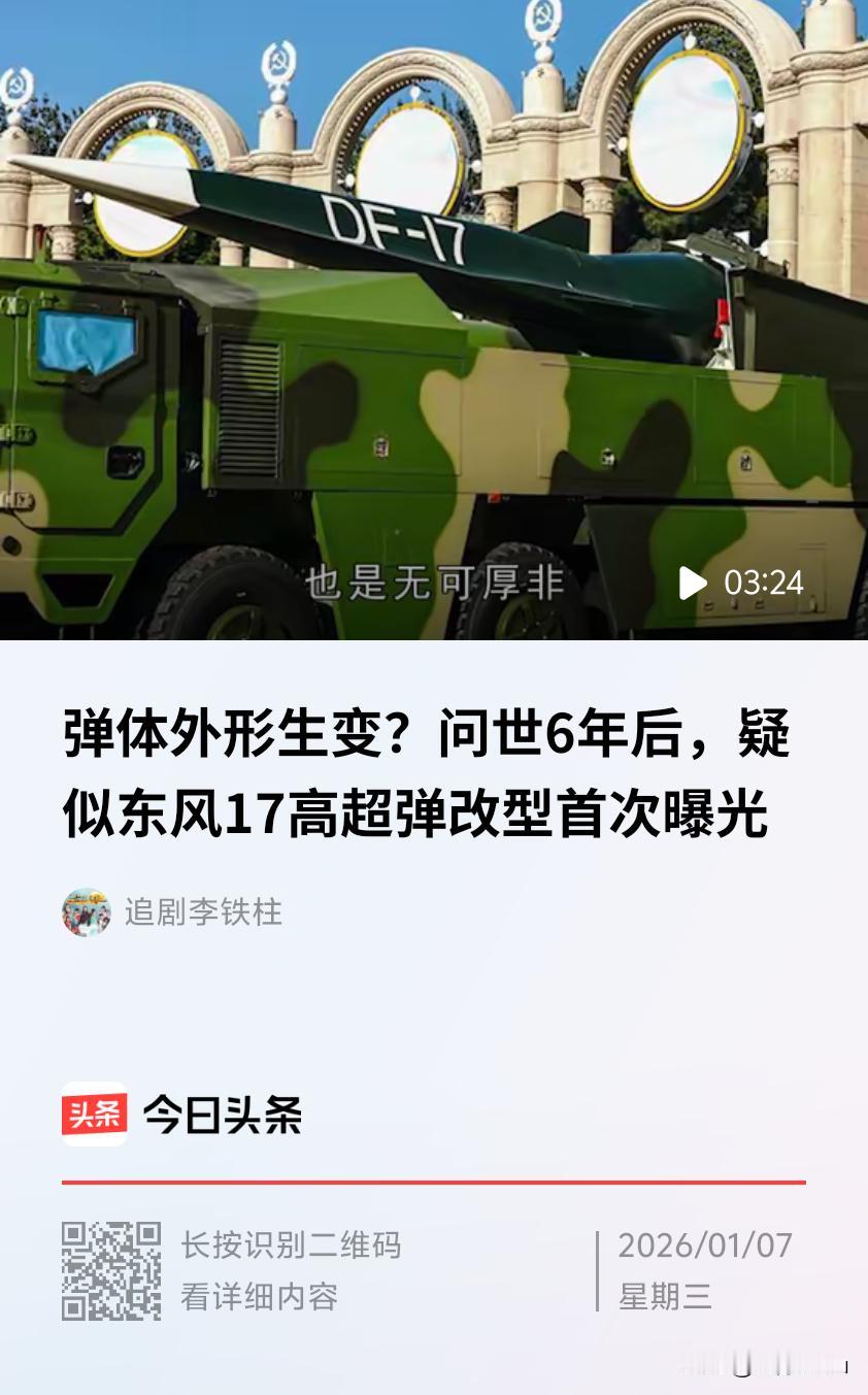 2026年1月4日央视军事频道播出的火箭军新年开训画面中,十多枚东风 - 17高超音速导弹成排亮相。此次大量亮出该导弹释放多重信号: 回应地区安全格局 部分国家在亚太部署反导网络、搅动地缘博弈,东风 - 17射程1500 - 1800公里,能覆盖关键区域,高效打击军事基地、航母编队等高价值目标,形成反介入与区域拒止能力。且它无依托发射、全地形机动,可在任意战场快速部署,让潜在挑衅者有所顾虑。 彰显技术实力与国防自信 在全球高超音速武器竞赛里,中国率先实战化部署东风 - 17,美国同类项目多次测试失败,俄罗斯型号侧重核打击,其常规打击优势形成独特代差。从2019年首次亮相到2025年公开夜间发射画面等,该导弹持续迭代,印证中国国防科技自主创新实力。 捍卫和平立场 东风 - 17不是用于主动攻击,而是打破“单向威慑”不平衡。它以“能打仗、能打赢”的硬实力,遏制霸权主义冒险冲动,为地区稳定筑牢安全屏障,体现中国“以战止战”的战略智慧。 展示作战能力成熟 此次展示表明东风 - 17已进入常态化、规模化作战使用阶段,数量问题不再敏感。过去美方暗示其数量有限,不足以冲击美军整体优势,此次展示说明中国已实现高超音速武器工业化扩产,具备高超音速导弹饱和打击条件,冲击美军在西太平洋的战术体系。 暗示新型号进展 遵循“装备一代、研制一代、预研一代、探索一代”思路,东风 - 17大方公开意味着国内下一代高超导弹研制顺利,甚至可能已取得突破性进展,这是一种“技术分代”的无声宣告。