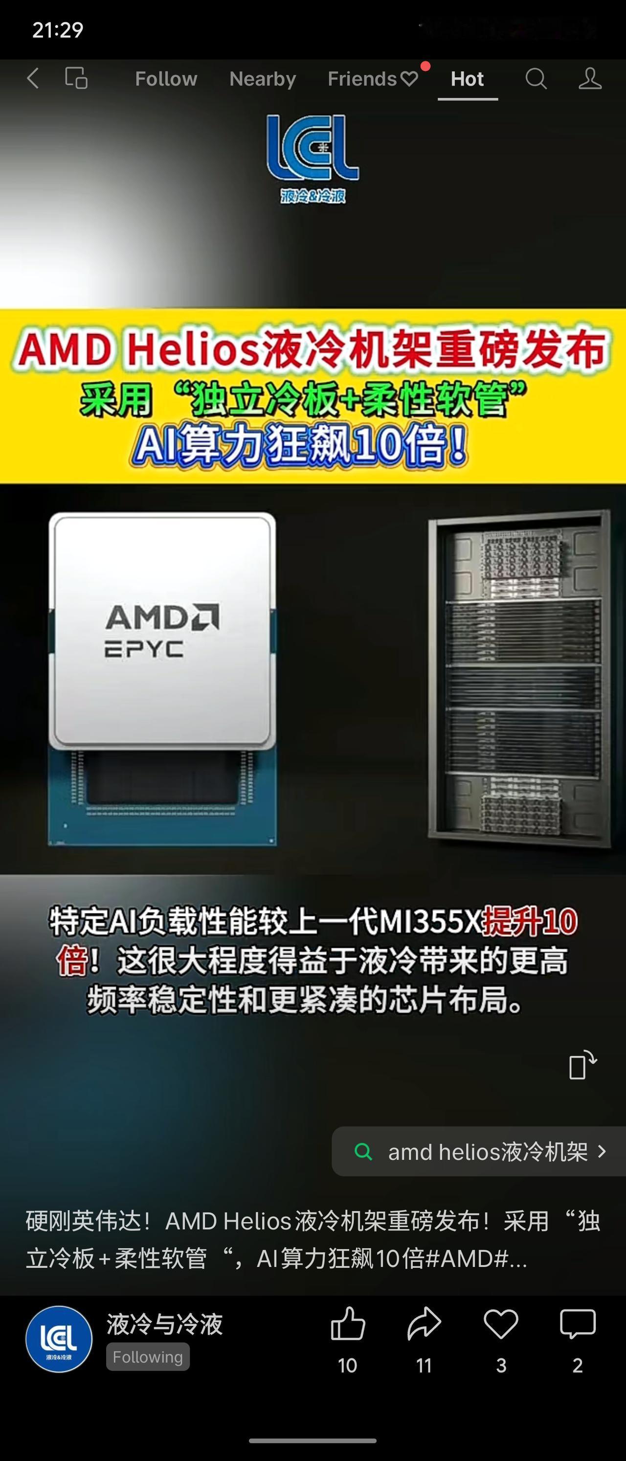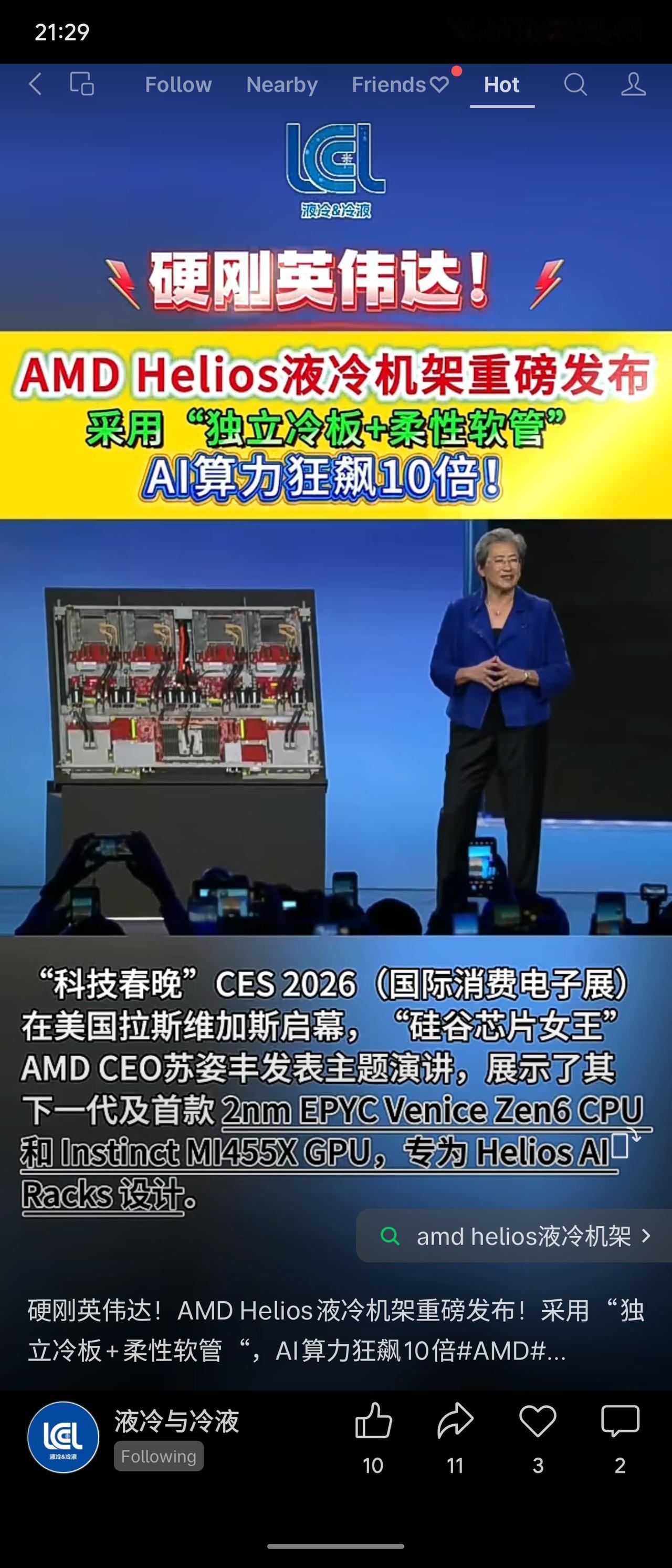 AMD在CES 2026发布Helios液冷AI机架,配备MI455X GPU与Zen6 CPU,采用独立冷板与柔性软管的全液冷设计,有效突破散热瓶颈,宣称AI算力较上代提升10倍,旨在高端AI算力市场与英伟达展开竞争。